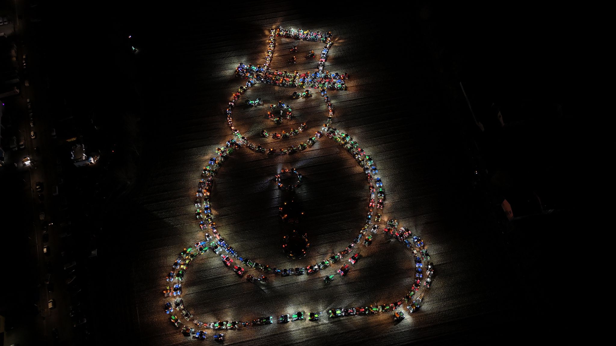 La ricetta è semplice e complessa al tempo stesso: nei giorni precedenti ci si ritrova sul terreno scelto per tracciare la figura a mezzo di pali e nastri. Una volta definita, si può iniziare a progettare la disposizione dei trattori. Poi, il giorno stesso, mano a mano che arrivano i partecipanti (sono circa 250) vengono accompagnati ai loro posteggi, in un delicatissimo incastro. Al calar del sole, inizia la coreografia di fanali, lampeggianti, luci e con il drone si può scattare la suggestiva immagine dall’alto. Intanto, inizia la festa, tra vin brulè, brindisi beneauguranti e solidarietà. Già perché ogni anno, insieme a questo simpatico ritrovo spontaneo, si accosta una raccolta fondi solidale, i cui fondi vengono devoluti all’ospedale torinese Regina Margherita, tramite l'Associazione Macrodattilia e Pros e il reparto Cardiochirurgia pediatrica dell'Ospedale. Ecco quindi che gli auguri di natale degli agricoltori beinettesi hanno un sapore ancora più speciale. L’iniziativa è curata da un gruppo di amici: Davide, Dario, Gianfranco, Giovanni, Paolo, Alex, Matteo, Flavio, Samuele, Adriano. Il brindisi finale è offerto da Agricolproject, ovvero Stefania Forneris e Flavio Lucchino mentre nel pomeriggio si gustano le caldarroste di Pier e il vin brulè di Adry. Il drone per lo scatto è stato guidato da Giorgia Tassone.