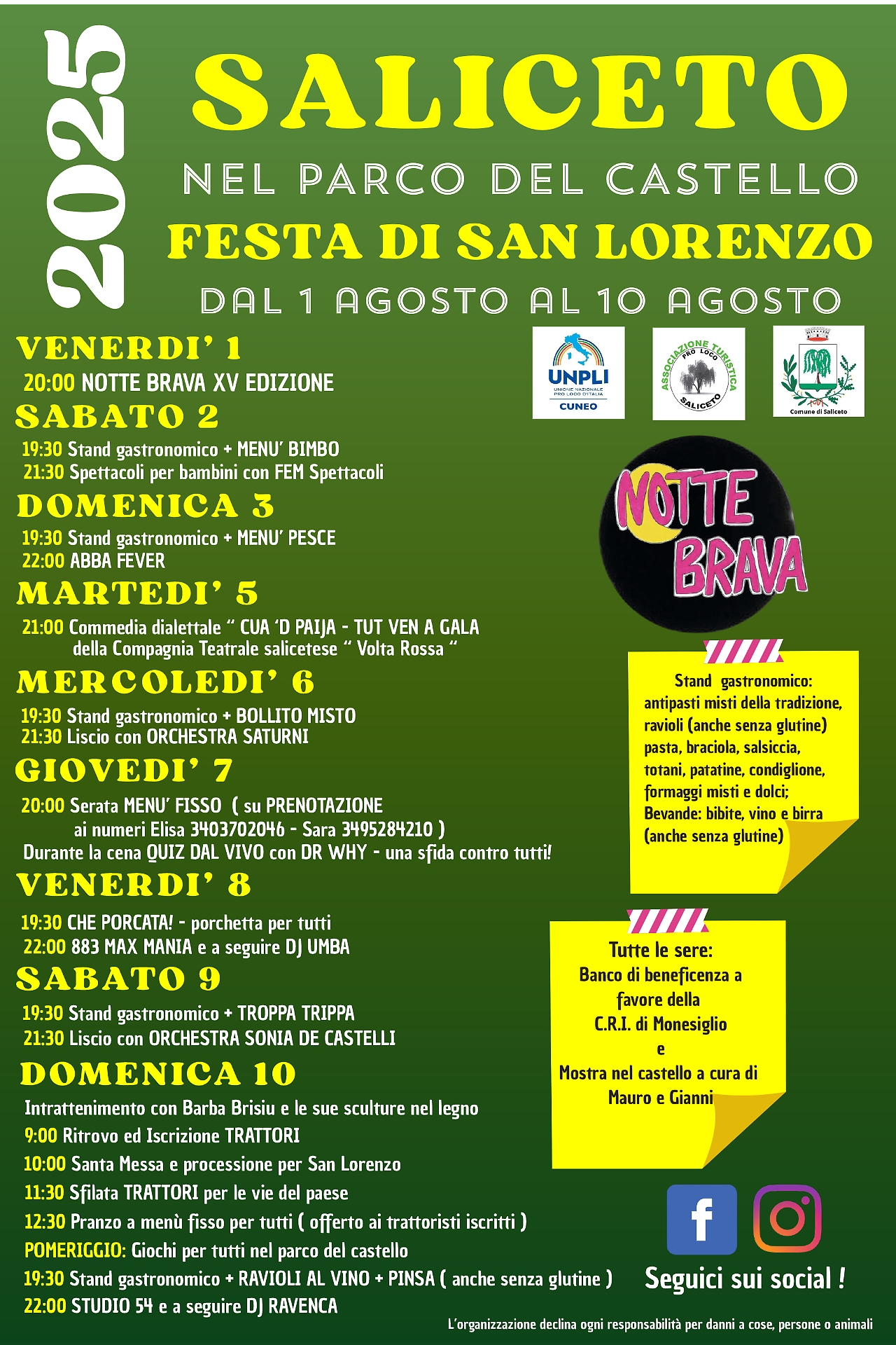Con la 15ª edizione della “Notte Brava” in programma venerdì 1º agosto a partire dalle 20, inizierà la festa patronale di San Lorenzo patrono di Saliceto, con una lunga kermesse di cibo e musica sparsi a piene mani nei vari punti del castello e del centro storico. Saranno ben 14 le postazioni in cui sarà distribuito il cibo nelle sue più varie declinazioni. Molte saranno anche le orchestre ed i gruppi che si esibiranno con il clou musicale notturno lasciato alla discoteca nel parco del castello.