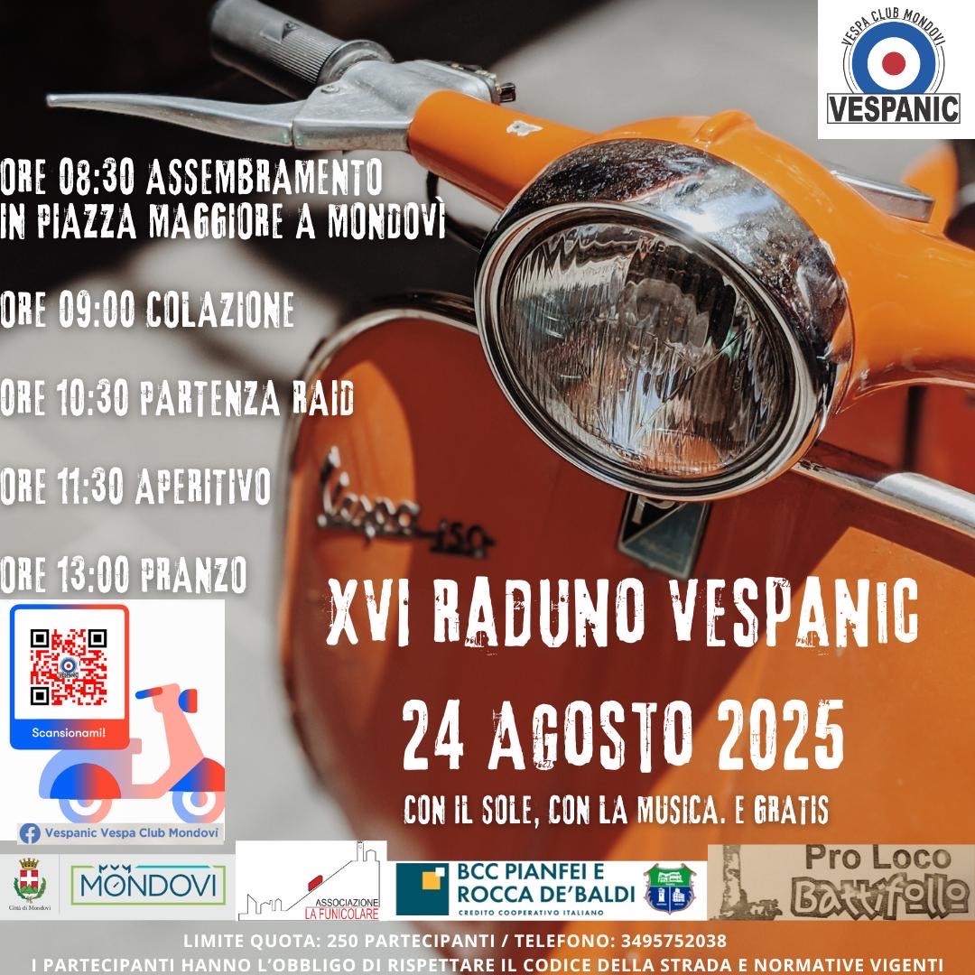 E come ogni anno il Vespa Club Mondovì VESPANIC omaggia le "Vespe" con una giornata dedicata. Domenica 24 agosto, le strade di Mondovì si coloreranno di storia e passione, con un raduno vespistico che promette di essere un evento indimenticabile per tutti gli amanti della Vespa e della bellezza delle vallate monregalesi. L’appuntamento è fissato per le ore 9 in Piazza Maggiore, dove i partecipanti si raduneranno per una giornata all'insegna del motore, del divertimento e della scoperta dei paesaggi mozzafiato che circondano Mondovì.