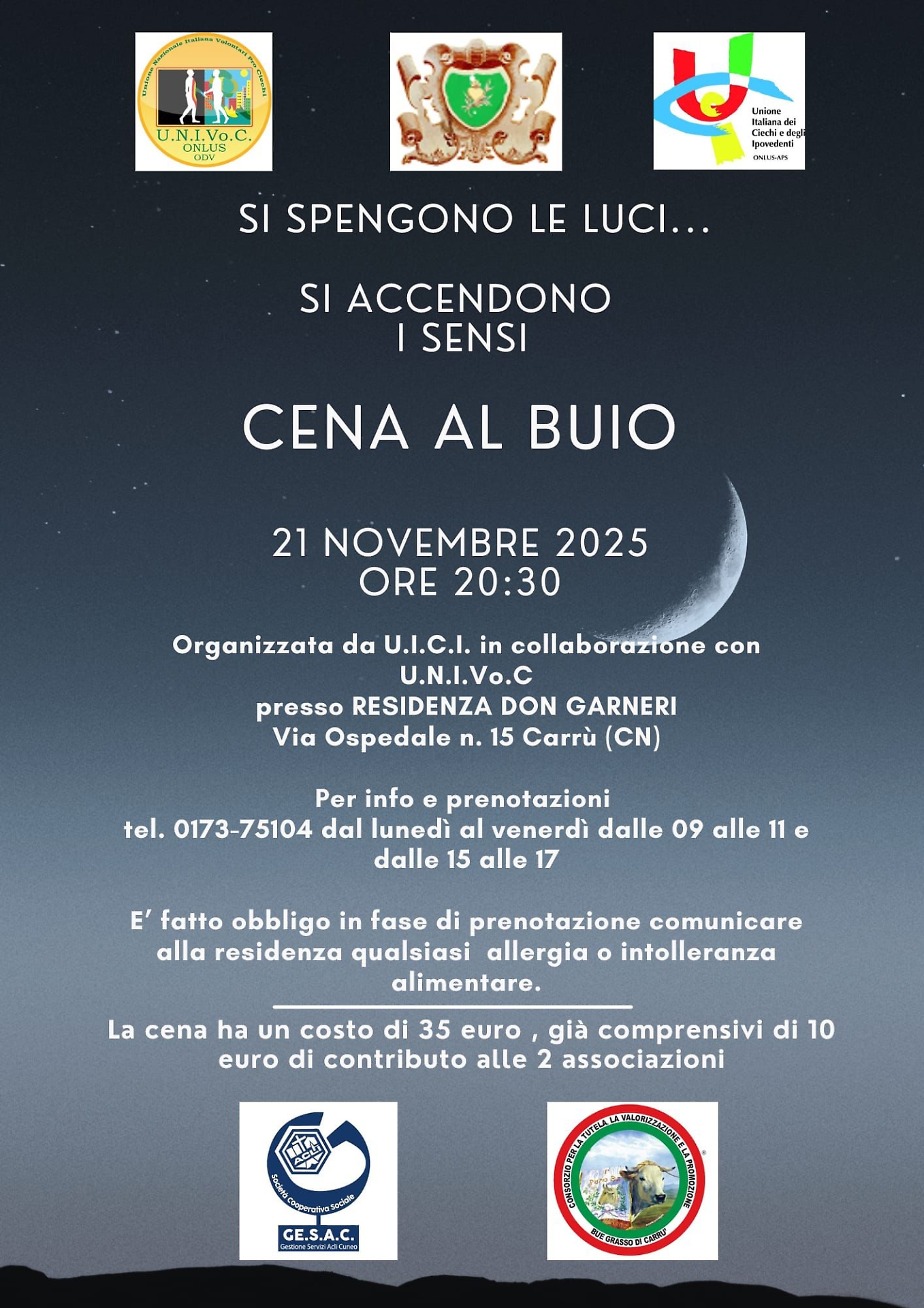 Venerdì 21 novembre, alle ore 20.30, la Residenza Don Garneri di Carrù ospiterà un evento particolare e ricco di significato: la “Cena al buio”. L’iniziativa, promossa dall’Unione Italiana dei Ciechi e degli Ipovedenti (U.I.C.I.) in collaborazione con l’U.N.I.Vo.C. (Unione italiana volontari pro ciechi), offre ai partecipanti l’opportunità di vivere un’esperienza sensoriale unica, in cui la vista lascerà spazio agli altri sensi per comprendere più a fondo il valore della percezione, dell’ascolto e dell’incontro.