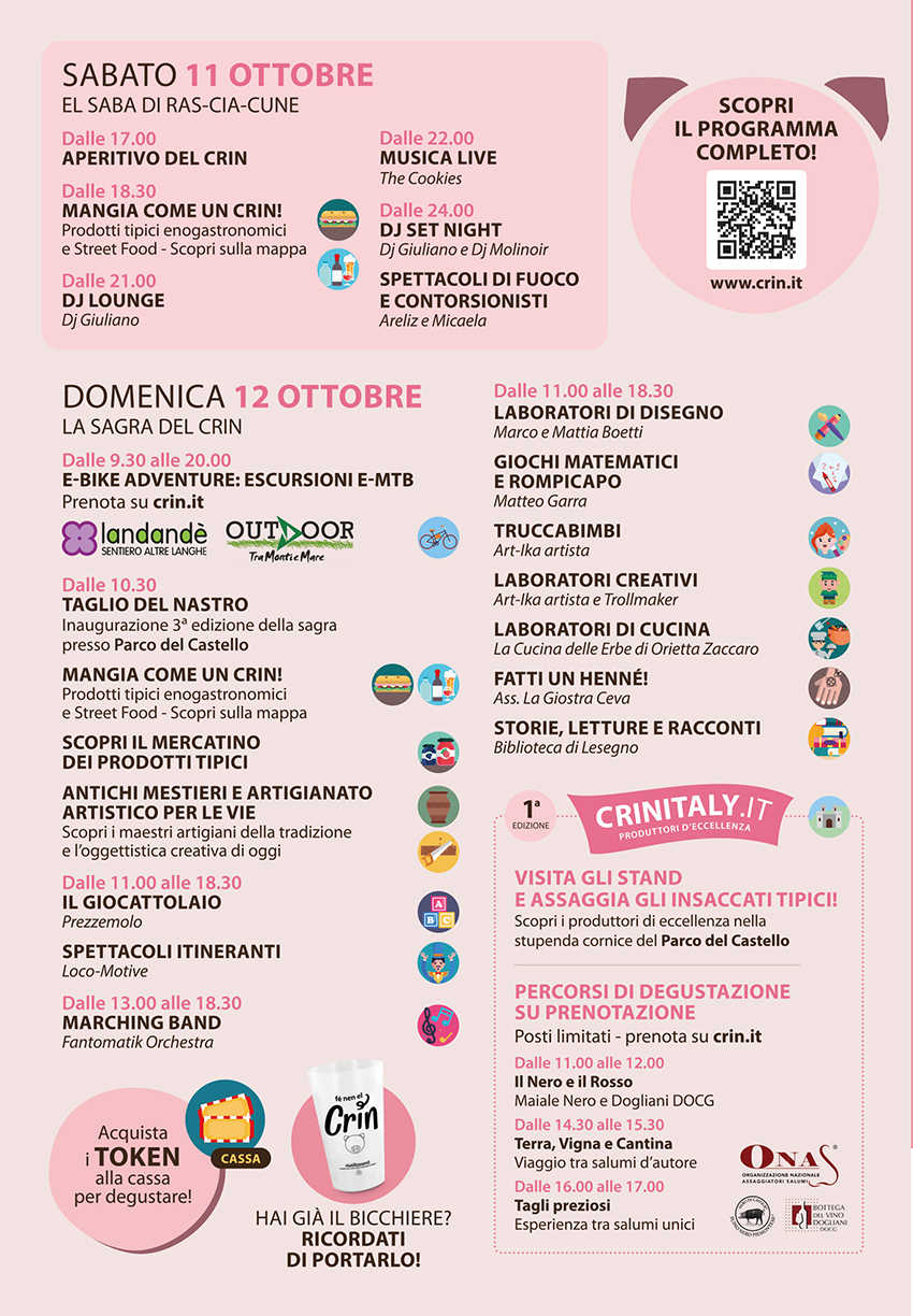 Due giorni ricchissimi di eventi, dedicati a ogni tipologia di pubblico, quelli che si terranno sabato 11 e domenica 12 ottobre in occasione della grande manifestazione della Sagra del Crin di Lesegno.