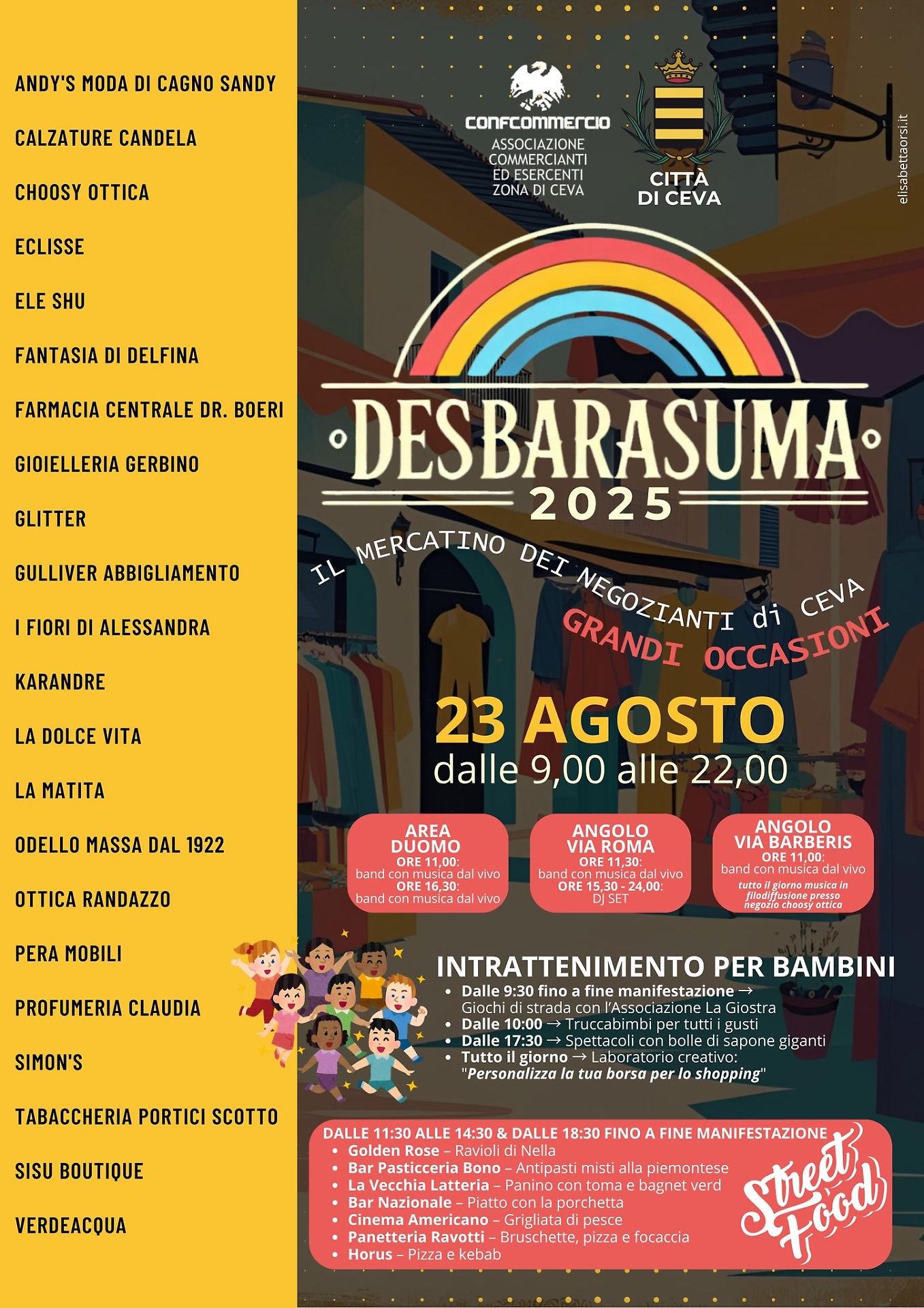 Il calendario estivo di Ceva continua alla grande. Sabato 23 agosto torna l’attesissimo “Desbarasuma”, organizzato dalla As.Com Ceva con il patrocinio del Comune. Per l’occasione i commercianti locali esporranno i propri prodotti direttamente davanti alle attività, con offerte speciali, musica e intrattenimento. A rendere l’atmosfera ancora più vivace contribuiranno i DJ set e gli appuntamenti enogastronomici, pensati per trasformare la serata in una vera festa di comunità.
