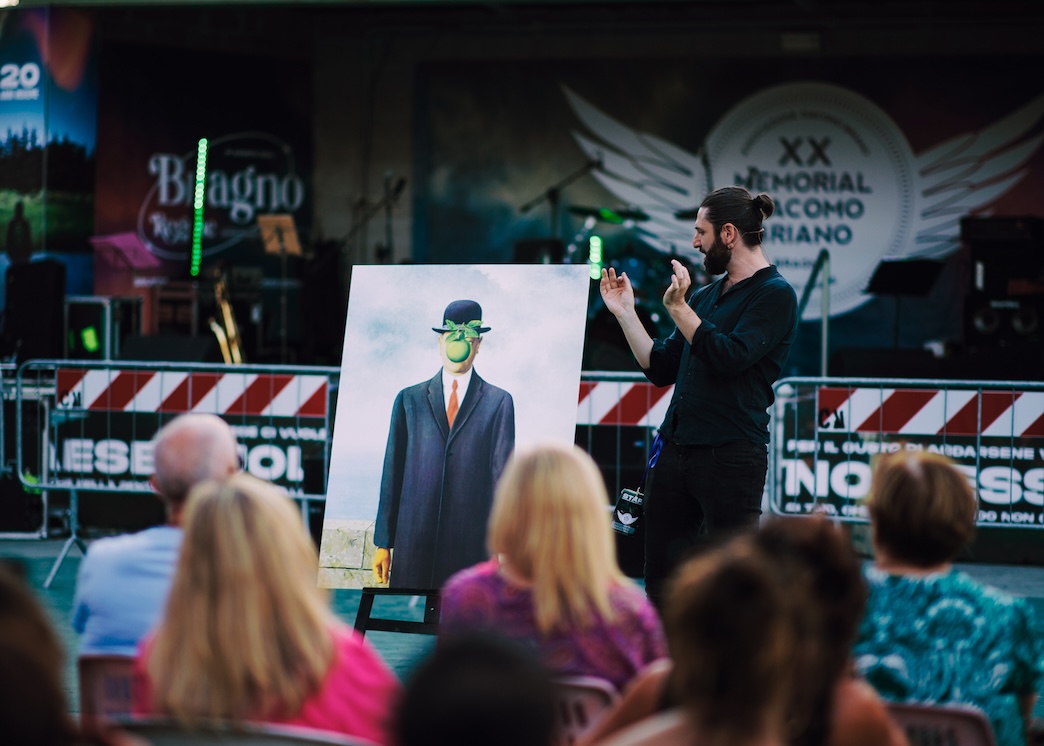 Alle 18:30 il professore e artista Alessandro Carnevale, noto al pubblico televisivo per la sua partecipazione al programma Rai “Il Collegio”, guiderà il pubblico in una lezione-spettacolo dedicata al valore dei simboli e della bellezza nel mondo contemporaneo.
