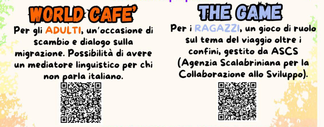 Si tratta di un pomeriggio insieme per conoscersi, condividere e riflettere. Due le attività proposte da Migrantes. Il “World Cafè” per gli adulti, un’occasione di scambio e dialogo sulla migrazione, con possibilità di contare su un mediatore linguistico facilitando chi non parla italiano. E “The Game” per i ragazzi, un gioco di ruolo sul tema del viaggio oltre i confini, gestito da ASCS (Agenzia Scalabriniana per la collaborazione e lo sviluppo).