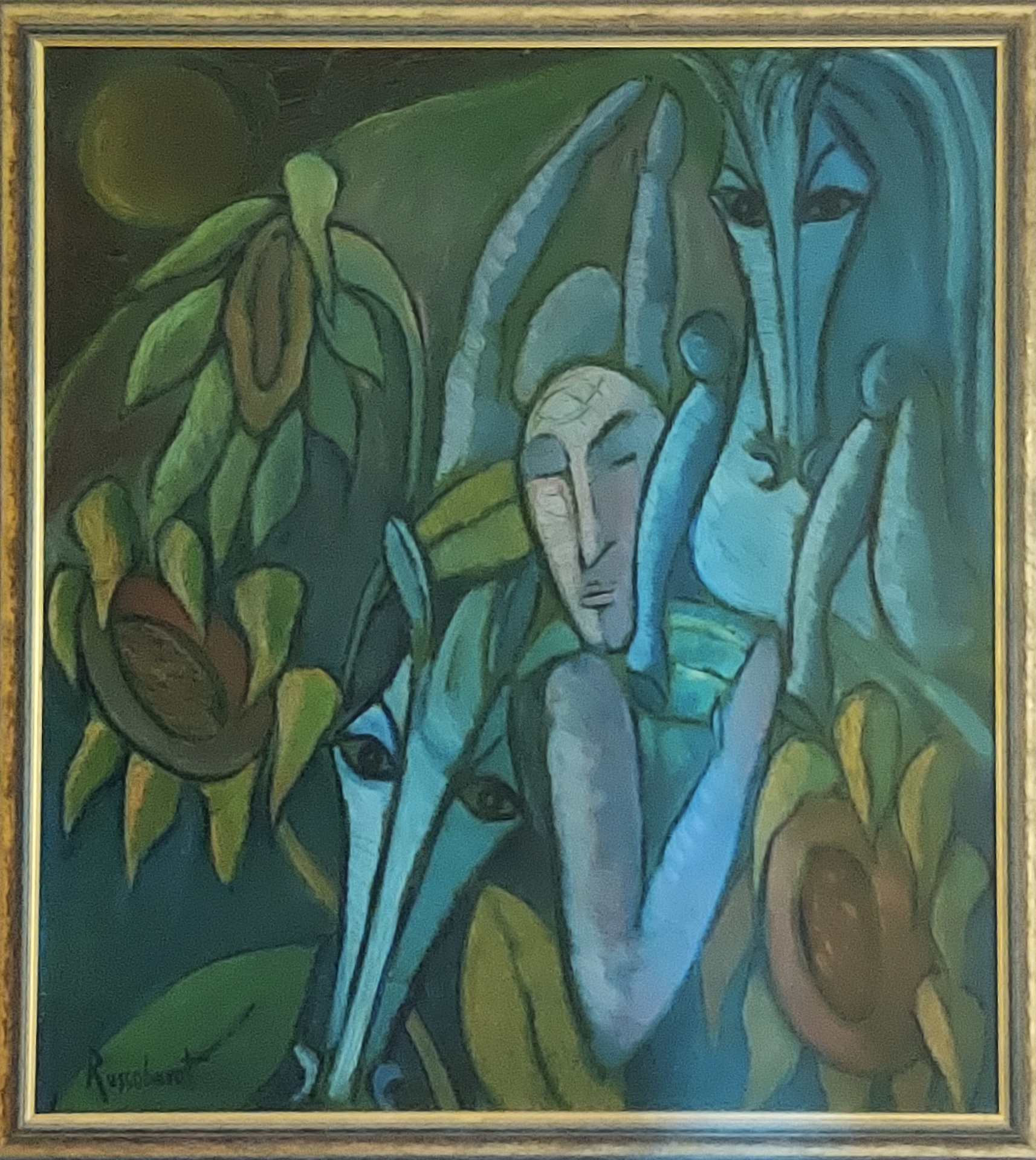 Francesco Russo “Buròt” – di origini carrucesi, classe 1945 – compì un lungo percorso sui versanti della pittura e della scultura. Si guardò intorno con la voracità dell’autodidatta ma con l’umiltà di chi punta a esempi alti, traendone stimoli da elaborare senza troppe soggezioni. E dalla sua instancabile attività di artista-artigiano scaturì un’intensa produzione di dipinti, disegni, incisioni e – in parallelo – di “sculture” su pietre, radici, legni e materiali di varia natura, rispettati nella loro essenza ma rivelati nelle loro forze segrete, nelle loro storie remote. Fu aiutato a coltivare le sue precoci attitudini dall’aria respirata in Carrù, a casa dello zio Luigi Borra, pittore, decoratore, musico e direttore di banda (dal quale derivò il soprannome “Buròt”, piccolo Borra). Lo incoraggiarono i carrucesi Emilio e Sandro Vacchetti e, verso i diciotto anni, il valdostano Italo Mus, che lo avviò a dipingere paesaggi montani all’aria aperta ammonendolo a non aver fretta di arrivare. Esempi di schiettezza gli trasmise anche Eso Peluzzi, approdato dall’entroterra ligure alle colline di Monchiero. Lo affascinarono poi gli acrobati e gli arlecchini che vedeva ritrarre da Max Dissar, un francese che si era fatto girovago al seguito di circhi.