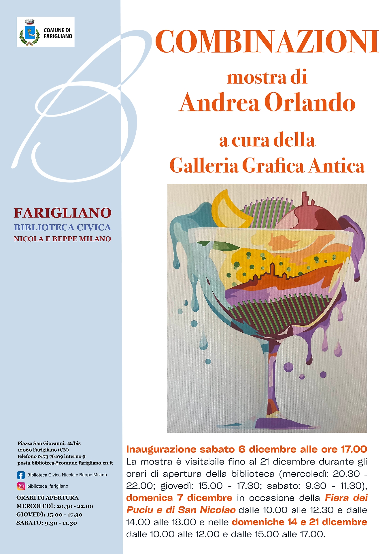 Sabato 6 dicembre, alle ore 17 la Biblioteca civica "Nicola e Beppe Milano" di Farigliano ospita l’inaugurazione della mostra “Combinazioni” di Andrea Orlando.