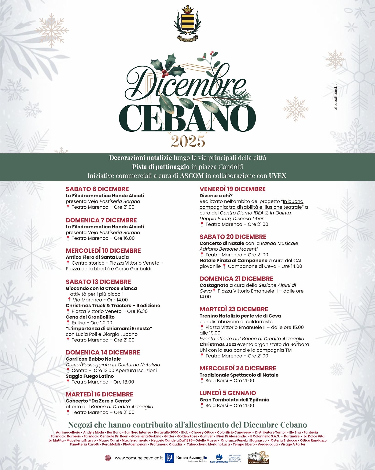 “Il Dicembre cebano è un contenitore in cui uniamo le forze che abitualmente si danno da fare per la nostra città – evidenziano il sindaco, Fabio Mottinelli e l'assessore Prato -. Coinvolgendo le varie realtà che operano sul territorio, dall’As.Com. alle Botteghe Cebane, dai commercianti alle Associazioni, abbiamo cercato di creare un vero e proprio 'cartellone' che possa accontentare i gusti di un pubblico il più ampio possibile. Attraverso la comune avventura con l'Amministrazione comunale di Perlo, che ringraziamo, estendiamo la collaborazione al territorio circostante, andando ad organizzare insieme un evento di sicuro impatto. Ringraziamo inoltre chi si è messo in gioco e ha collaborato nell’allestimento del programma, i commercianti, gli sponsor privati che ci sostengono, e auguriamo a tutti, cebani e non, di vivere al meglio le prossime festività natalizie”.