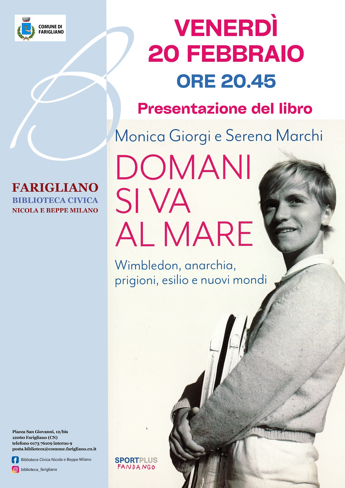 Venerdì 20 febbraio alle ore 20.45 la Biblioteca civica di Farigliano ospiterà in presenza Monica Giorgi e in collegamento Serena Marchi per la presentazione del libro "DOMANI SI VA AL MARE".