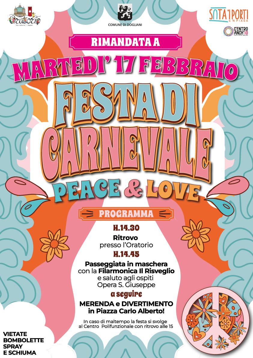 L’appuntamento, dedicato al tema “Peace & Love”, prenderà il via alle ore 14.30 con il ritrovo presso l’Oratorio; alle ore 14.45 è prevista la passeggiata in maschera per le vie del paese, accompagnata dalla Società Filarmonica Il Risveglio, con saluto agli ospiti dell’Opera S. Giuseppe.