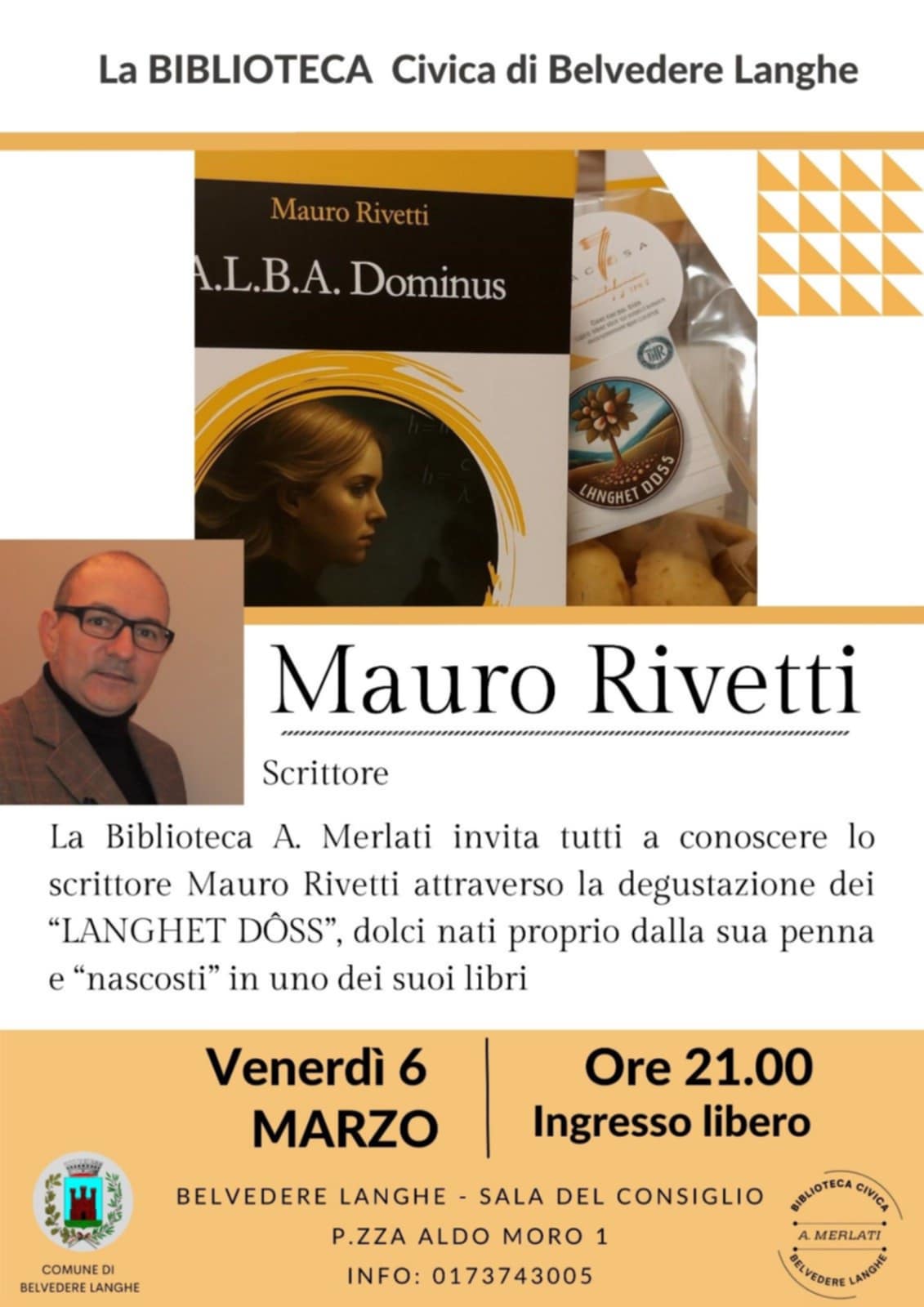 La Biblioteca Civica "A. Merlati" di Belvedere Langhe propone una serata all’insegna della cultura e della convivialità. Venerdì 6 marzo, alle ore 21, la Sala del Consiglio (piazza Aldo Moro 1) ospiterà l’incontro con lo scrittore Mauro Rivetti. L’ingresso è libero.