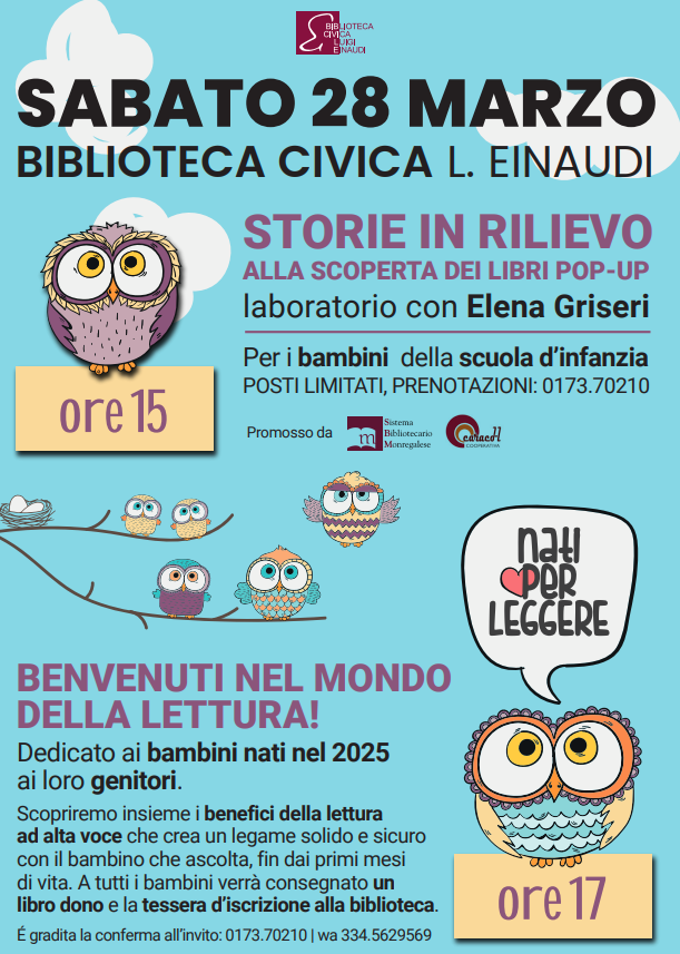 Sabato 28 Marzo, l’Assessorato all’Istruzione di Dogliani e la Biblioteca Civica “Luigi Einaudi” organizzano una giornata con due appuntamenti dedicati ai più piccoli presso la sede della biblioteca. L’iniziativa rappresenta un’occasione per avvicinare i bambini, fin dai primi mesi di vita, al mondo dei libri e per appassionarli al piacere della lettura.