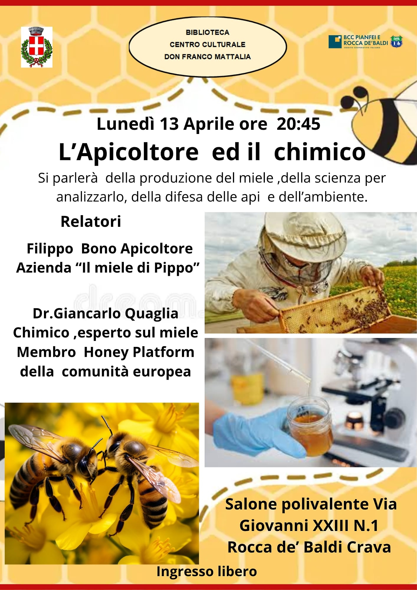 La Biblioteca "Don Franco Mattalia" invita ad un appuntamento imperdibile dedicato alla scoperta di uno degli ecosistemi più complessi e vitali del nostro pianeta. La serata, dal titolo emblematico "L’Apicoltore e il Chimico", si terrà lunedì 13 aprile ore 20:45 presso il Salone Polivalente di via Giovanni XXIII n. 1, a Rocca de’ Baldi Crava.