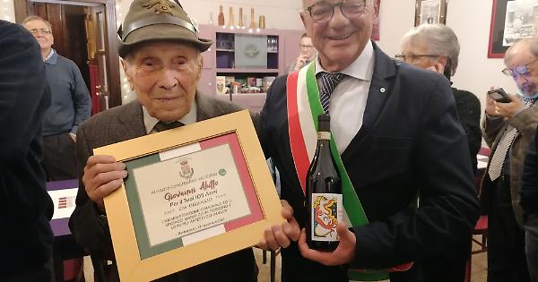 Giovanni Alutto, con il sindaco di Barbaresco, che gli ha donato una bottiglia di Barbaresco 2016