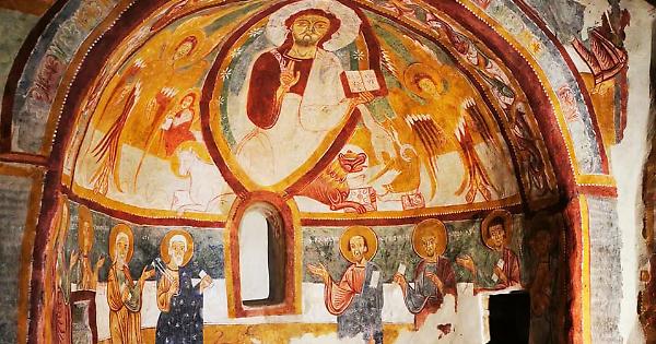 Particolare degli affreschi all'interno della Pieve di San Maurizio, a Roccaforte