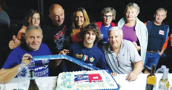Foto di gruppo di Kevin Cristino con Mario Albesiano e il direttivo Major Motor. Dietro il papà Gianfranco, mamma Manuela e la sorella Elena, anche lei tesserata Major.