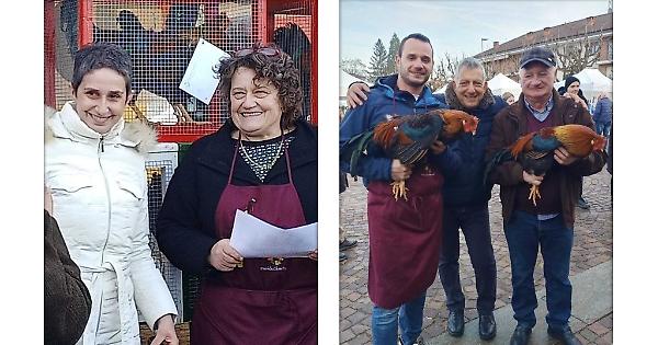 A sinistra la signora Zucchi riceve il premio, a destra la coppia di capponi vincitrice