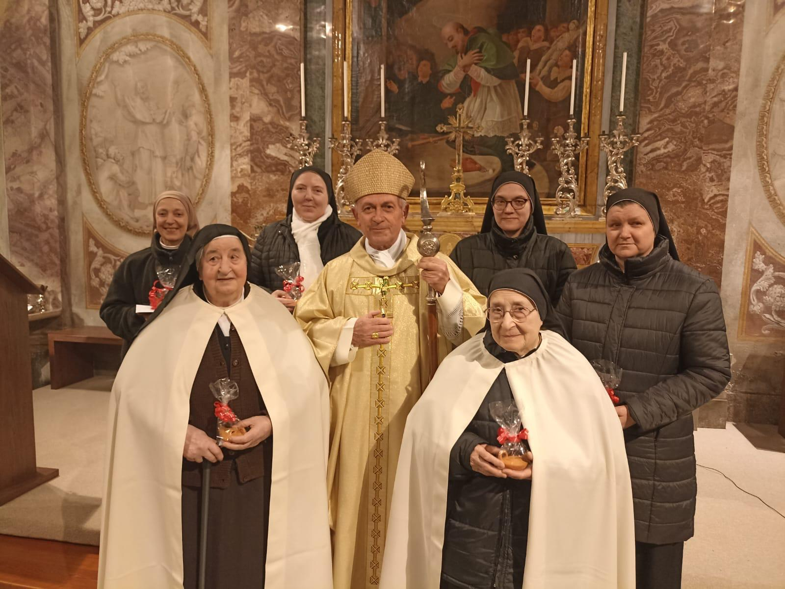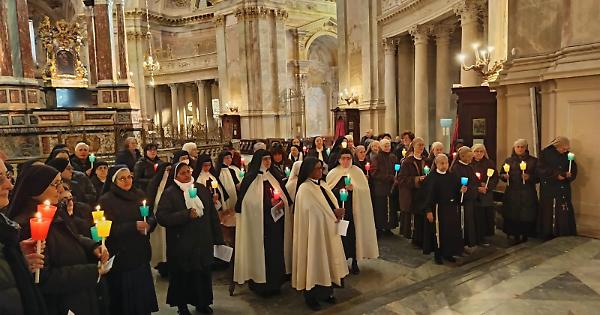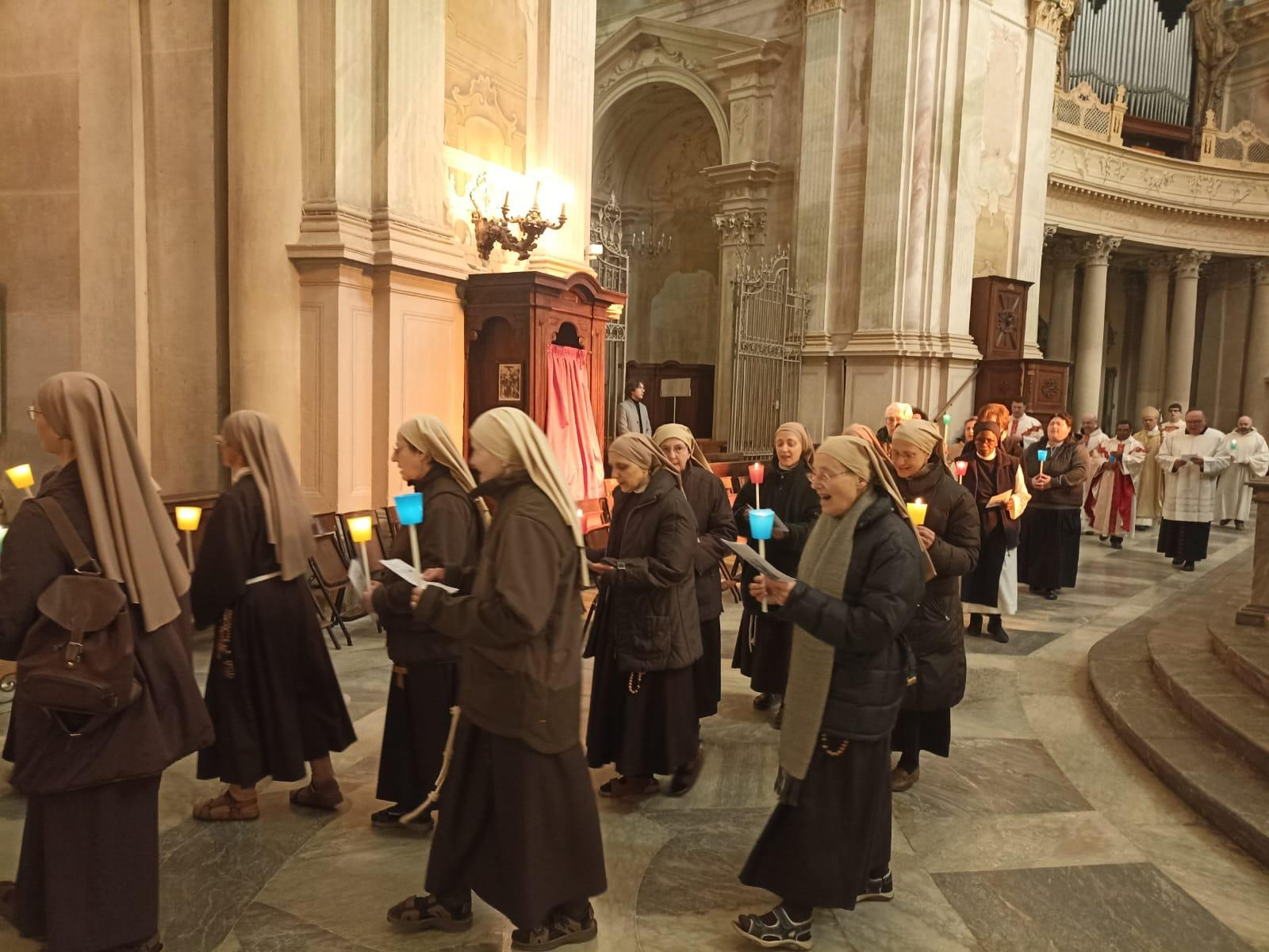 Nella giornata dedicata alla vita consacrata, domenica 2 febbraio, festa della Presentazione di Gesù al tempio, una sessantina di religiose operanti in diocesi, unitamente ad alcuni religiosi, sono convenute al Santuario di Vicoforte, attorno al vescovo, per la celebrazione giubilare. Fatto eccezionale, poi, quello che ha visto la presenza delle monache clarisse del Monastero di S. Chiara a Vicoforte, con la comunità accresciuta dall’arrivo delle sorelle del monastero di Leivi. Dopo la liturgia della luce e la processione attorno al Pilone della Regina Montis Regalis, mons. Egidio Miragoli ha presieduto la concelebrazione nella cappella di S. Francesco di Sales. Nell’occasione sono stati ricordati alcuni anniversari significativi di professione religiosa: sr M. Ferdinanda 70 anni di professione; sr M. Consolata e sr M. Enrichetta 60 anni di professione (religiose queste delle Carmelitane di S. Teresa presenti a Piazza). Sr Lucia, sr Antonietta e sr Amalia delle Suore Missuonarie della Passione, 25 anni di professione religiosa; così come sr Elena delle Clarisse di Vicoforte. Al termine della celebrazione, il delegato per la vita consacrata, mons. Jean Pierre Ravotti, ha invitato a pregare perché la fiamma della consacrazione religiosa mai si spenga nella nostra Chiesa monregalese. “Riconoscere il dono della vocazione, non tradirlo, contando sulla grazia del Giubileo” Nella Giornata della vita consacrata e nella Festa della presentazione del Signore, il vescovo ha presieduto l’Eucaristia al Santuario per l’esperienza giubilare condivisa «Tante circostanze diverse e significative ci riuniscono qui, in questo giorno, per una celebrazione densa di significati e di suggestioni. Oggi, anzitutto, è la festa della Presentazione al tempio di Gesù, uno degli episodi più intimi e toccanti dell’infanzia del Signore, anche per i personaggi che coinvolge – ha detto il vescovo mons. Egidio Miragoli alla celebrazione in Santuario in cui si è vissuta l’esperienza giubilare da parte delle religiose e dei religiosi presenti in diocesi, per la Giornata della vita consacrata, nella festa della Presentazione del Signore –. Inoltre, è la Festa della vita consacrata (ovvero di tutti i consacrati, di tutti coloro che hanno seguito i consigli evangelici di povertà, castità, obbedienza); per tradizione e per conseguenza, è pure la festa di ringraziamento specialmente per coloro che ricordano gli anniversari di consacrazione religiosa. Infine, quest’anno, è occasione di Giubileo per tutti voi. Ognuno di questi temi meriterebbe una parola». Gli Istituti di vita consacrata: la fantasia dello Spirito «La prima che vorrei spendere è per la varietà degli Istituti, e quindi dei carismi, qui presenti e rappresentati, che saluto cordialmente. Nel corso degli anni tutti gli Istituti di vita consacrata si sono ridotti di numero; e tuttavia anche nella nostra diocesi resta una rappresentanza di tanti Istituti diversi, ognuno dei quali esprime un carisma, un dono dello Spirito. Istituti di vita contemplativa, di vita attiva e di vita mista, femminili e maschili, “Ordo virginum”, Istituti secolari – e perché non citarle? – anche forme di consacrazione individuale. Potremmo dire che la varietà e i diversi colori dei vostri abiti sono come una rappresentazione cromatica della creatività dello Spirito e della ricchezza della nostra Chiesa locale come di quella universale. Creatività che potremmo anche definire fantasia, ma sempre con l’accortezza di ricordare che tutti siete accomunati da una medesima convinzione e una medesima vocazione: vi uniscono la consapevolezza dell’amore del Signore e la stessa risposta data a una chiamata. La Vigna ha bisogno di tanti lavoratori, con mansioni e attitudini diverse, ma tutti cooperanti allo stesso fine e per la stessa ragione». Nuovi arrivi e nuovi cammini «In questa occasione salutiamo e accogliamo ufficialmente le Clarisse che dal Monastero di Leivi, in Liguria, sono giunte nei giorni scorsi in diocesi, diventando un'unica comunità, un unico monastero con le sorelle di Vicoforte. L’occasione del Giubileo permette al vescovo di autorizzare oggi la loro presenza in questo Santuario. Una scelta dettata da difficoltà e motivi contingenti. Hanno compiuto un lungo cammino, geograficamente ma anche simbolicamente parlando, come sempre accade quando si lascia il luogo in cui si vive per spostarsi definitivamente altrove. Ora le attende un cammino altrettanto impegnativo, anche se meno vistoso, un cammino umano e spirituale per diventare una sola comunità e per entrare e camminare in una Chiesa diocesana con la sua storia e le sue tradizioni, cui doneranno l’arricchimento della loro presenza e il contributo del loro agire, e da cui si spera riceveranno quella vera accoglienza che è scambio profondo e proficuo. Le accompagniamo con la nostra preghiera». (testo integrale dell’omelia, sul giornale cartaceo in edicola)