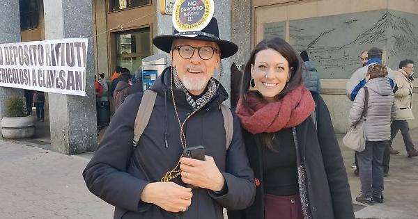 Giulia Marro con il designer Chris Bangle (componente del Comitato del no), davanti al palazzo della Provincia di Cuneo