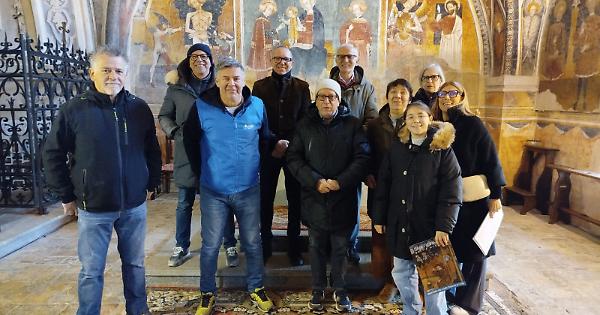 Dario Vergassola con gli amici, all'interno della chiesa di San Fiorenzo di Bastia
