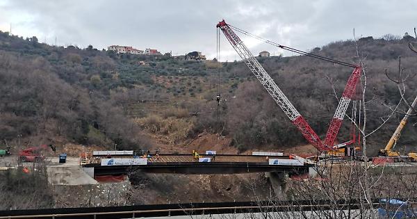 L'impalcato appena posato nella sua sede da una grande gru