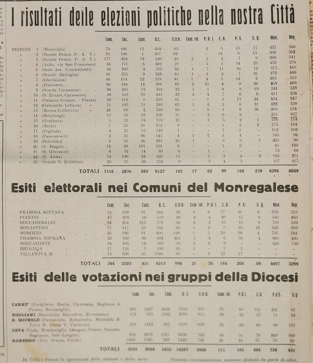 A Mondovì la Monarchia raccolse 6.296 contro i 6.049 della Repubblica. Il simbolo più votato votato, manco a dirlo, fu la DC con 6.122 voti, a cui seguivano i Socialisti con 2.896 e i Comunisti con 1.116.