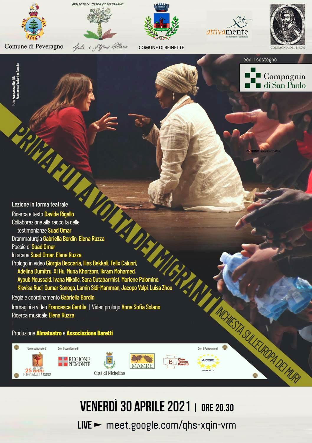 "Prima fu la volta dei migranti" è una lezione in forma teatrale che vuole rendere memoria delle scelte politiche, delle responsabilità e dei fatti che in vent'anni di storia hanno permesso l'affermarsi dell'attuale contesto nell'Unione europea, dove i muri stanno avendo la meglio sui diritti e molte nazioni hanno costruito sulle loro frontiere vere e proprie barriere per impedire l'ingresso dei migranti nei loro territori.
