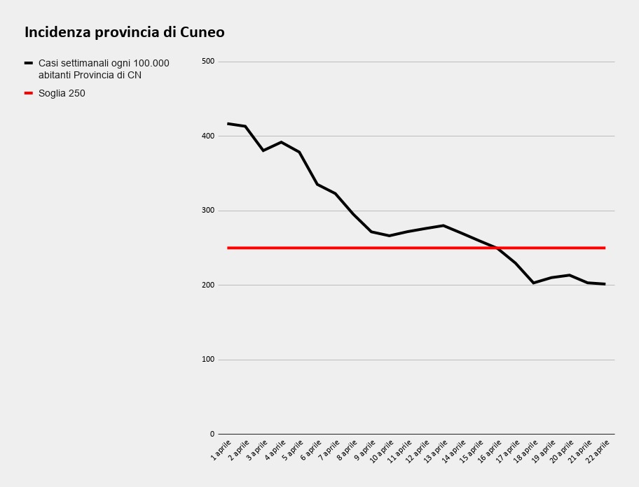 La soglia "zona rossa" è a 250 casi settimanali ogni 100 mila abitantiVersione web de L'"Unione Monregalese", settimanale cattolico di informazione, notizie ed opinioni di Mondovì. Iscr. n°8 Reg. Canc. Trib. di Mondovì del 05-04-1951.