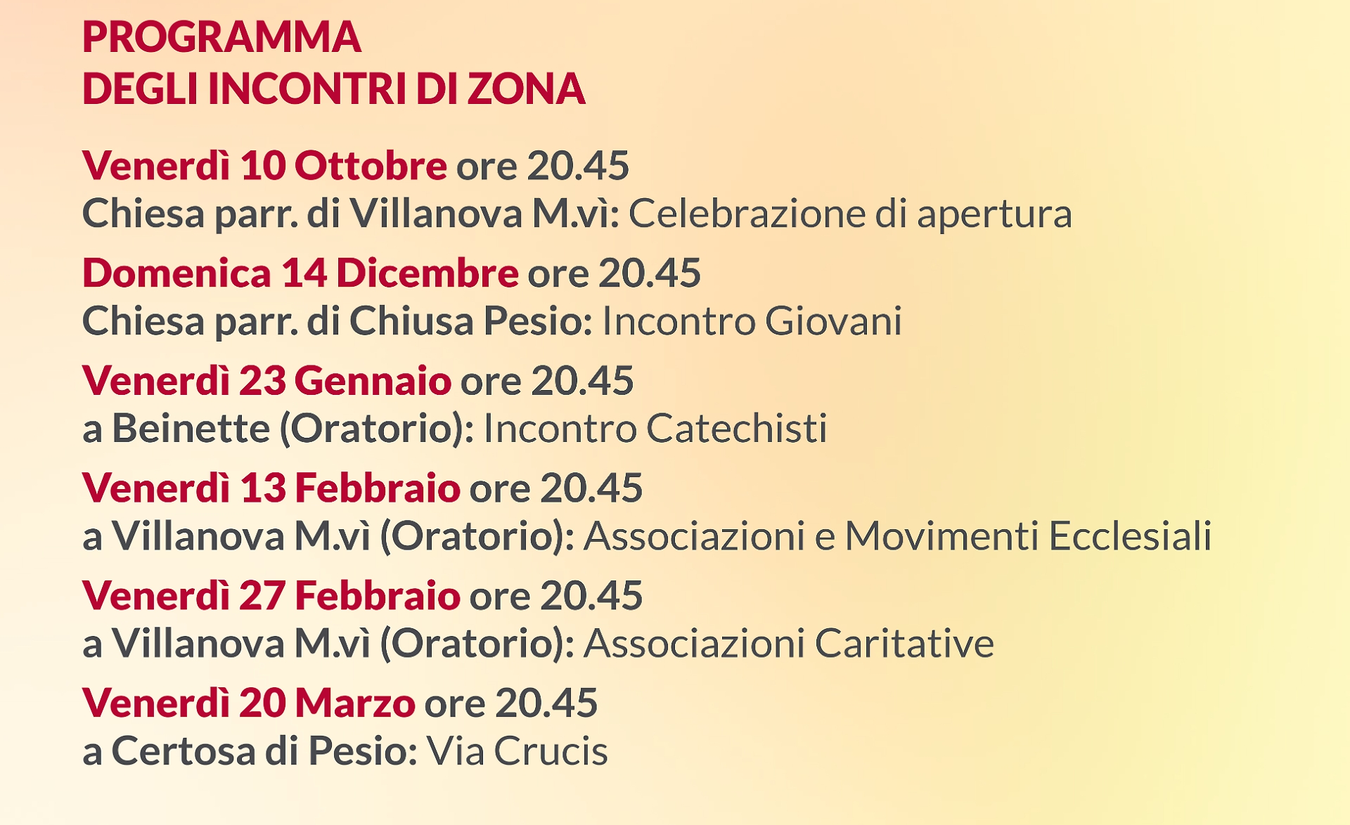 Sono attesi i sacerdoti e gli appartenenti alle varie parrocchie. Dopo questa prima Messa, comincerà il calendario di appuntamenti nella Zona pastorale, che comprende Villanova, Roccaforte, Chiusa di Pesio, Frabosa Sottana, Frabosa Soprana, Pianfei, Margarita, Morozzo, Beinette e Peveragno.