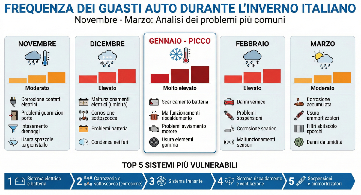 L'infografica mostra chiaramente come la frequenza dei guasti vari durante i mesi invernali. Novembre e marzo presentano livelli moderati, mentre dicembre e febbraio registrano livelli elevati. Il picco critico si verifica a gennaio, quando la combinazione di freddo, umidità e sbalzi termici mette sotto stress tutti i sistemi del veicolo.