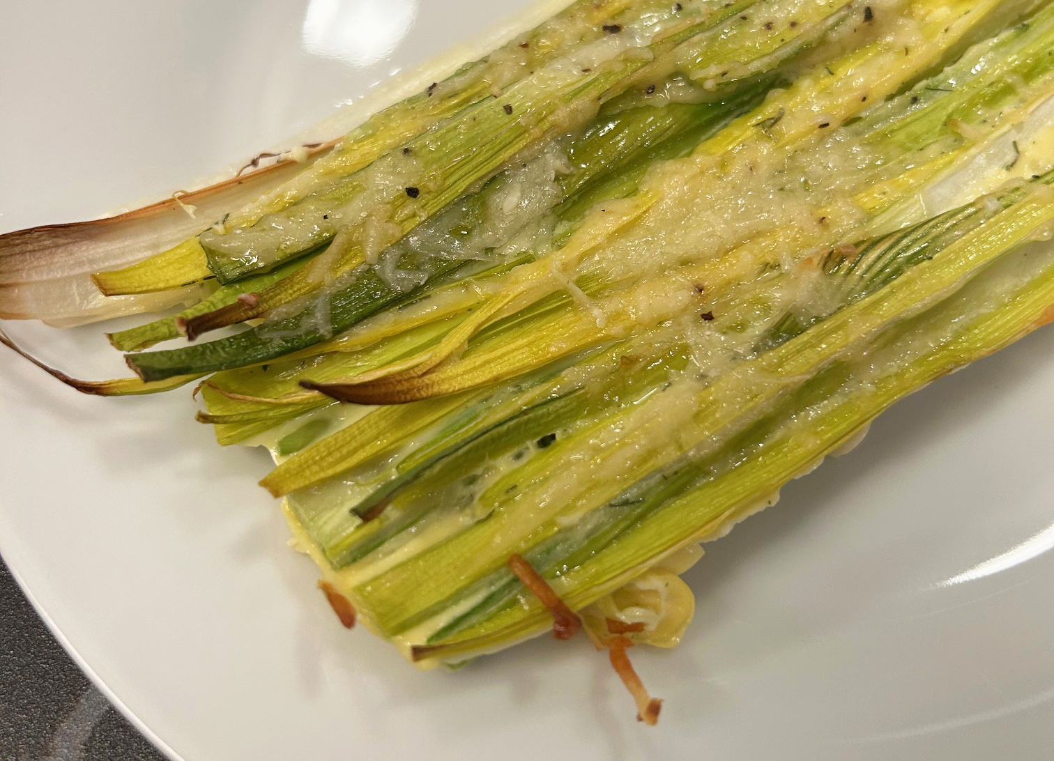 Cospargere con il composto i porri nella teglia e terminare con il parmigiano grattugiato.