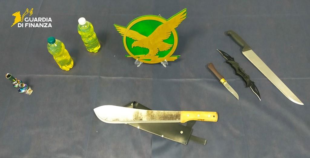 Li hanno fermati per un nomale controllo: ma il conducente non aveva la patente. A insospettire gli uomini delle Fiamme Gialle, poi, è stato l'atteggiamento. Così i militari della Guardia di Finanza di Savona hanno perquisito l'auto: trovando a bordo due machete, due coltelli, due bottiglie contenenti benzina ed hashish.