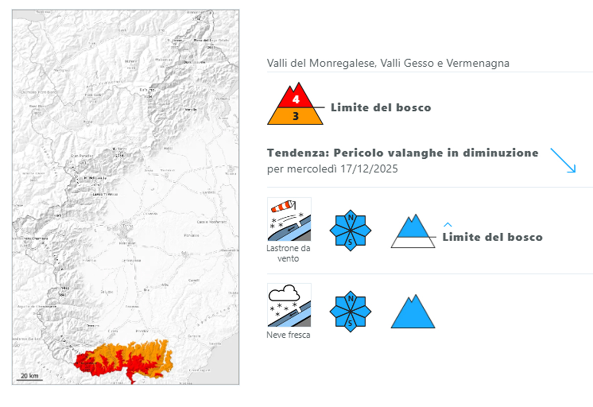 Per l'area "Valli del Monregalese, Valli Gesso e Vermenagna": Grado di pericolo 4 – forte