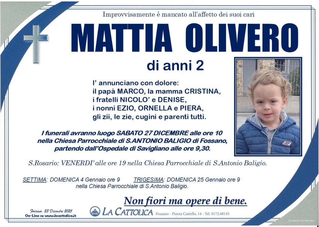 Una tragedia silenziosa e inspiegabile ha colpito la comunità di Fossano: il piccolo Mattia Olivero, appena due anni, si è addormentato per il riposino pomeridiano e non si è più risvegliato. L’episodio è avvenuto lunedì 22 dicembre, nella casa di famiglia, nella frazione di Sant’Antonio Baligio.