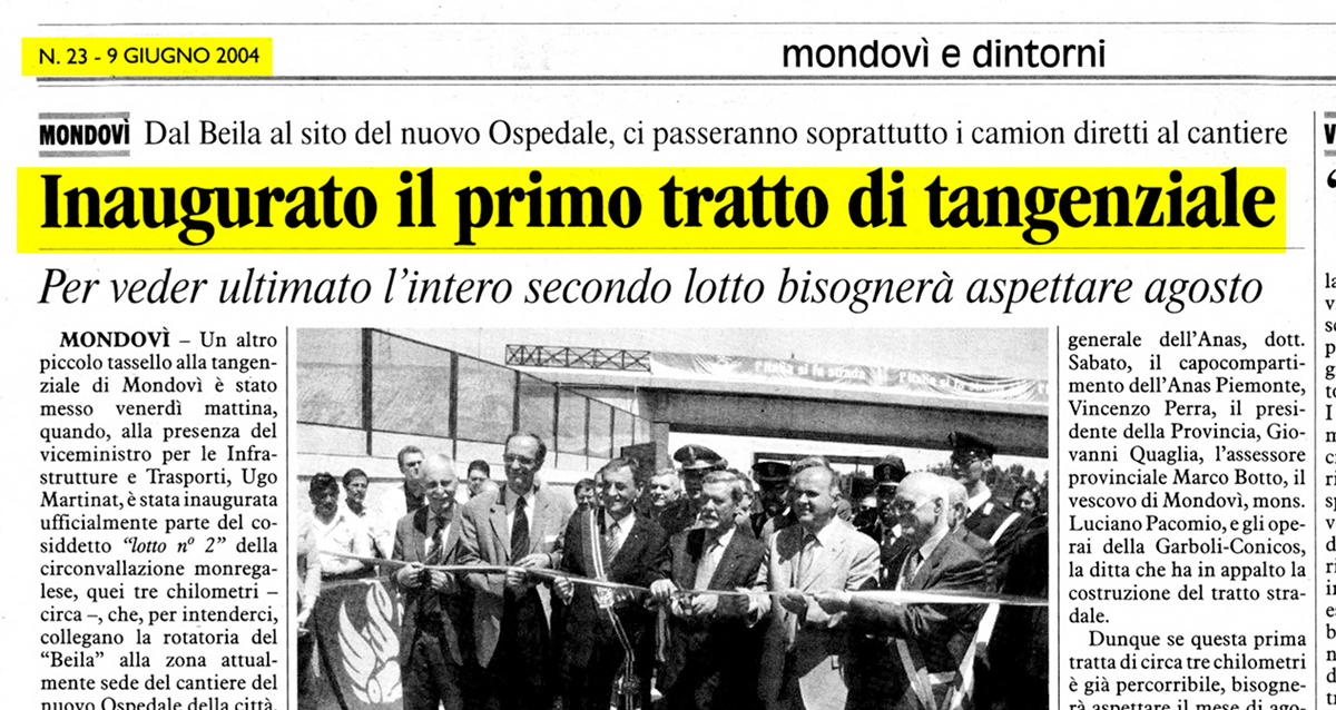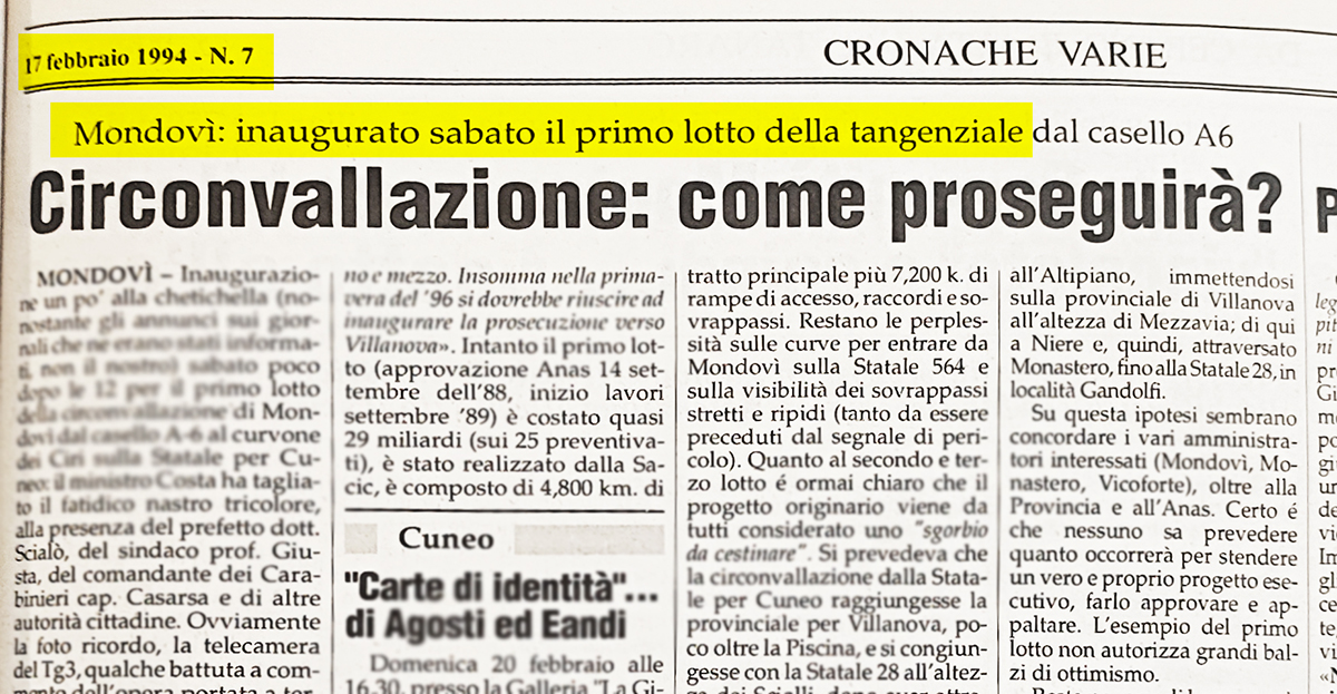 Un po' di storia (e cronistoria) all'indomani della notizia dell'approvazione, da parte di ANAS, del progetto esecutivo del III lotto della tangenziale di Mondovì. Un'opera da cui si parla da 20 anni... o trenta.. e forse addirittura quaranta. Era il 12 febbraio 1994 – sì, 31 anni fa. «Inaugurato il primo lotto della tangenziale di Mondovì». Col ministro Raffaele Costa, il sindaco prof. Michelangelo Giusta, autorità e telecamere. Era il tratto che andava dal casello A6 alla provinciale per Cuneo. «Bisogna accelerare per il secondo lotto», disse il ministro Costa. Settembre 2004, dieci anni dopo, ventun anni da oggi: apre tutto il “secondo lotto” che collegava la provinciale per Villanova (la rotonda “del Beila” all’Ospedale e a via Cuneo. Il sindaco era Aldo Rabbia. E tutti dissero: «Ora avanti con l’iter per il lotto numero 3». E poi ci sono altre date. Come l’aprile 2006, quando ANAS annunciò: «Approvato il progetto preliminare del terzo lotto» (una curiosità: erano i giorni in cui morì papa Giovanni Paolo II, Karol Wojtyla: se consideriamo che l’annuncio del progetto esecutivo è arrivato nel giorno dell’elezione di Papa Leone XIV, la battuta su ciò che avviene “ogni morte di papa” è quasi scontata). O il maggio 2008: quando un finanziamento della Regione diede un “boost” al progetto. O il febbraio 2014 (11 anni fa) quando, davanti a una sala strapiena di sindaci al Poli di Mondovì, l’allora ministro Maurizio Lupi garantì: «Il terzo lotto della tangenziale di Mondovì è una priorità». O il sopralluogo dell’ottobre dello stesso anno. O il 2018, quando ANAS parlava di «appalto nel 2019» e l’assessore regionale Balocco disse che «l’opera non è stata finanziata».E infine, le date più importanti nei tempi recenti: giugno 2021, quando il progetto del “terzo lotto” venne assegnato alle mani di un commissario straordinario ANAS per velocizzare il tutto, e il marzo 2024, quando ANAS confermò il finanziamento dell’opera. Trent’anni esatti dopo l’apertura del “lotto 1”, venti dopo il “lotto 2”, forse quaranta da quando se ne è iniziato a parlare.