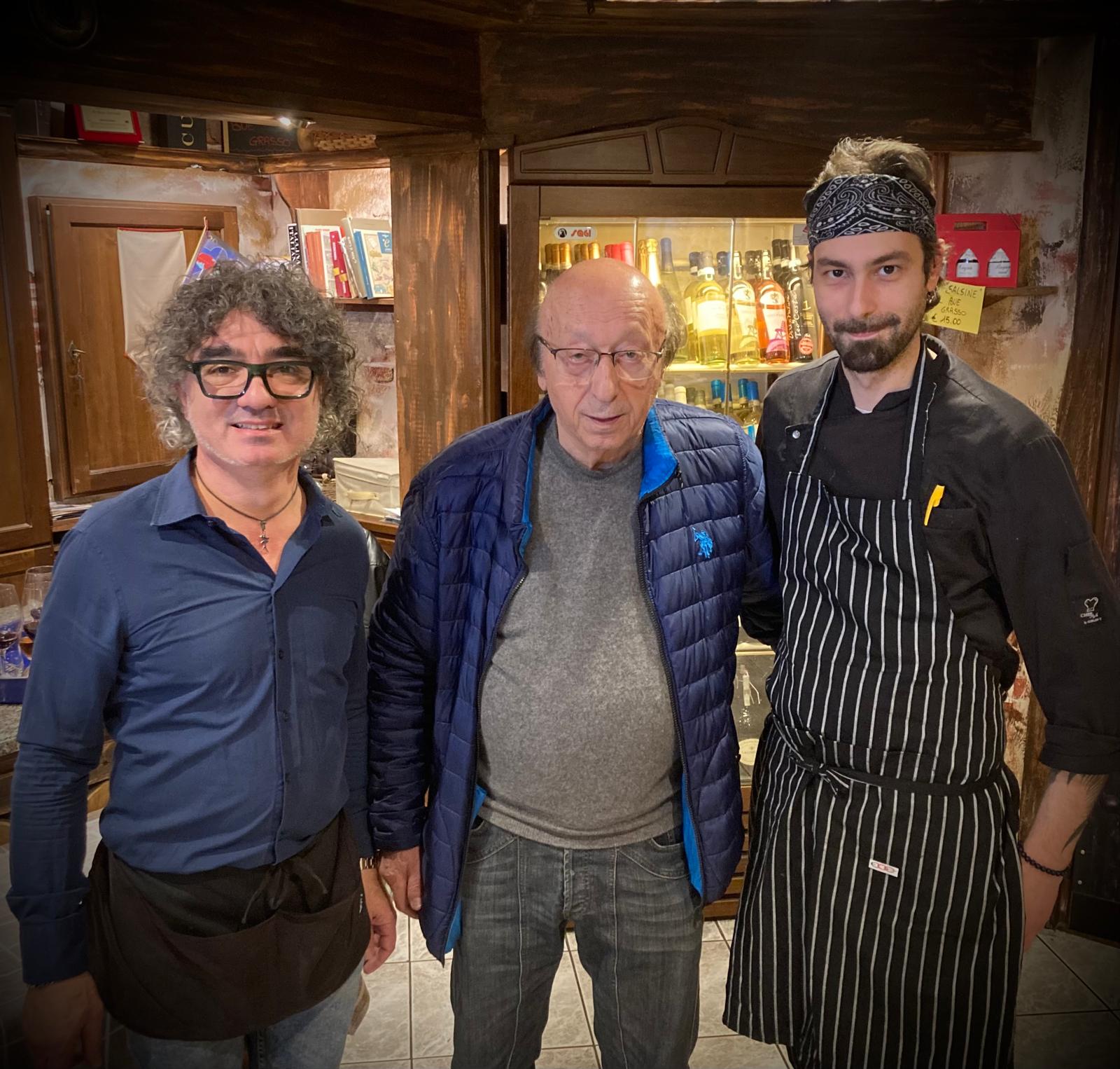Luciano Moggi ospite al "Bue grasso" di Carrù con il titolare Ezio Caula e il cuoco Francesco Alberto