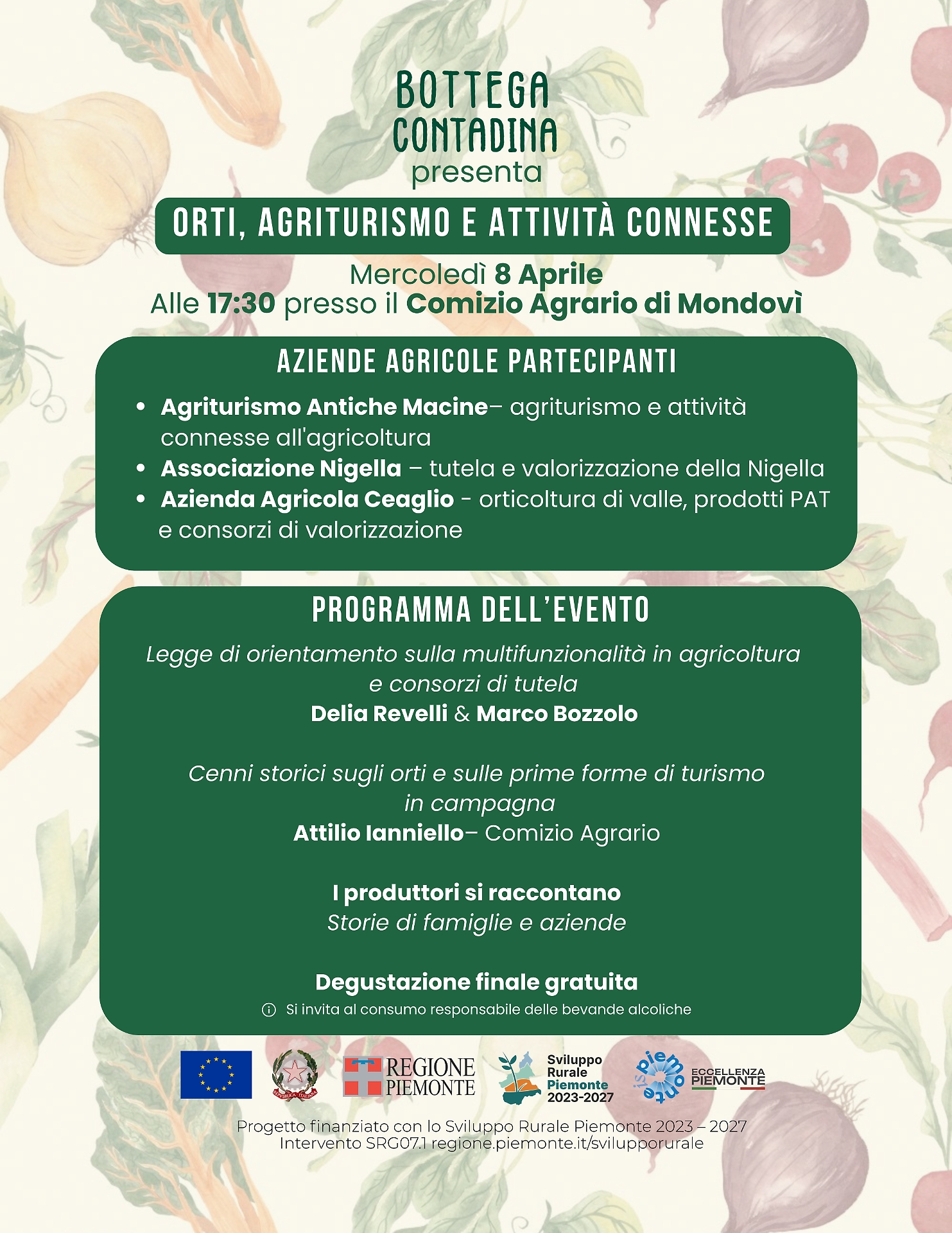 Nel corso dell’incontro, Delia Revelli e Marco Bozzolo approfondiranno il tema della legge di orientamento sulla multifunzionalità in agricoltura e il ruolo dei consorzi di tutela, mentre Attilio Ianniello del Comizio Agrario di Mondovì offrirà un contributo storico sugli orti e sulle prime forme di turismo in ambito rurale.