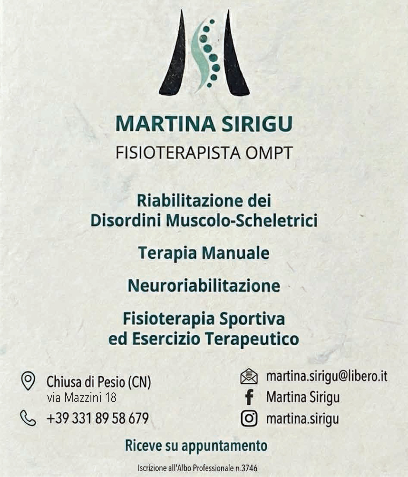 Dopo la laurea con lode in Fisioterapia presso l’Università del Piemonte Orientale, Martina Sirigu si è specializzata nella riabilitazione dei disturbi muscolo-scheletrici e neurologici, ottenendo il titolo di Orthopaedic Manipulative Physical Therapists, conforme a standard formativi internazionali. Ha inoltre conseguito nel 2020 un corso relativo alla neuro-riabilitazione dell’adulto con disturbi neurologici (concetto Bobath) e, nel 2024, un master all’Università di Genova dedicato al trattamento dei disturbi muscolo-scheletrici e alla terapia manuale. È anche fisioterapista certificata per la riabilitazione motoria del paziente con malattia di Parkinson.