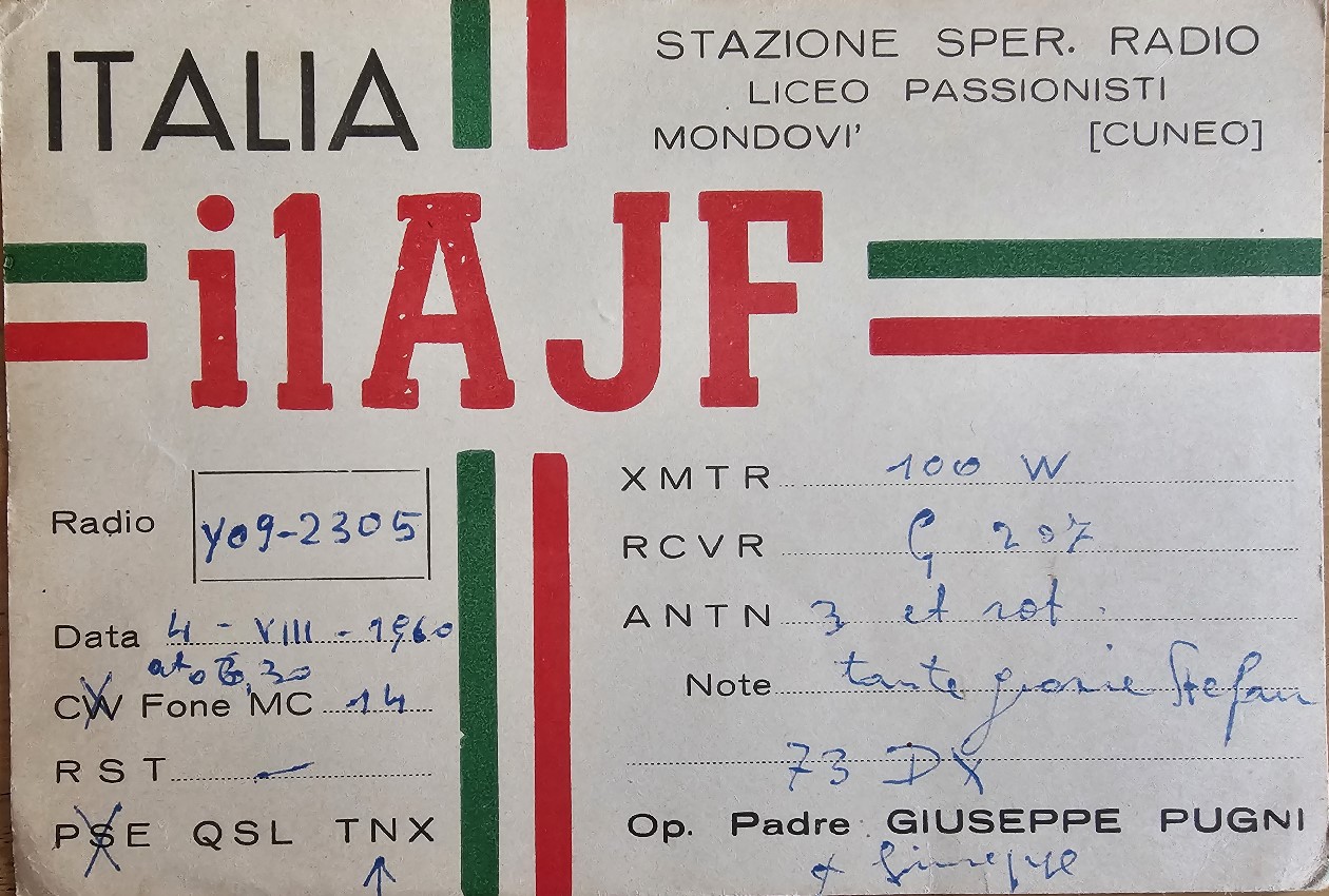 Stando alla ricerca, il primo radioamatore monregalese fu il professor Giuseppe Pugni: «Proveniente dal Convento dei Padri Passionisti di Arcellasco (Como), che nel 1945 ottenne il nominativo di stazione di radioamatore I1AJF (ex I1PD provvisorio assegnatogli prima del secondo conflitto mondiale), che all’inizio del 1950 si trasferì a Mondovì alla Congregazione della Passione di Gesù Cristo dove vi rimase sino alla fine del 1967, e che in seguito venne trasferito al Convento dei Frati Passionisti di Torre Cambiaso a Genova Pegli».