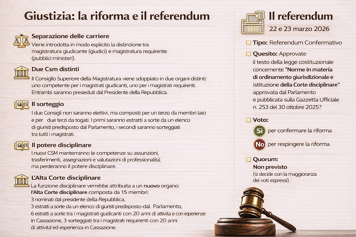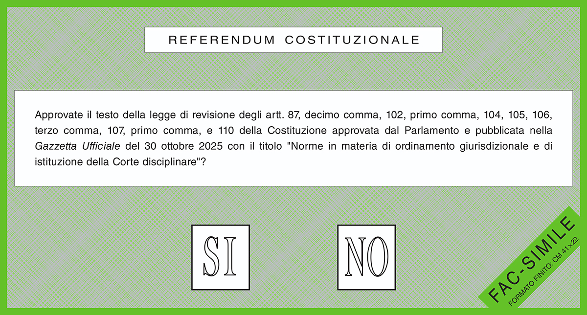 Il 22 e 23 marzo gli elettori italiani sono chiamati a votare un referendum costituzionale sull’ordinamento giurisdizionale, che incide sull’organizzazione della Magistratura. Il voto riguarda una legge di revisione della Costituzione già approvata dal Parlamento e che entrerà in vigore solo se riceverà la conferma degli elettori.
