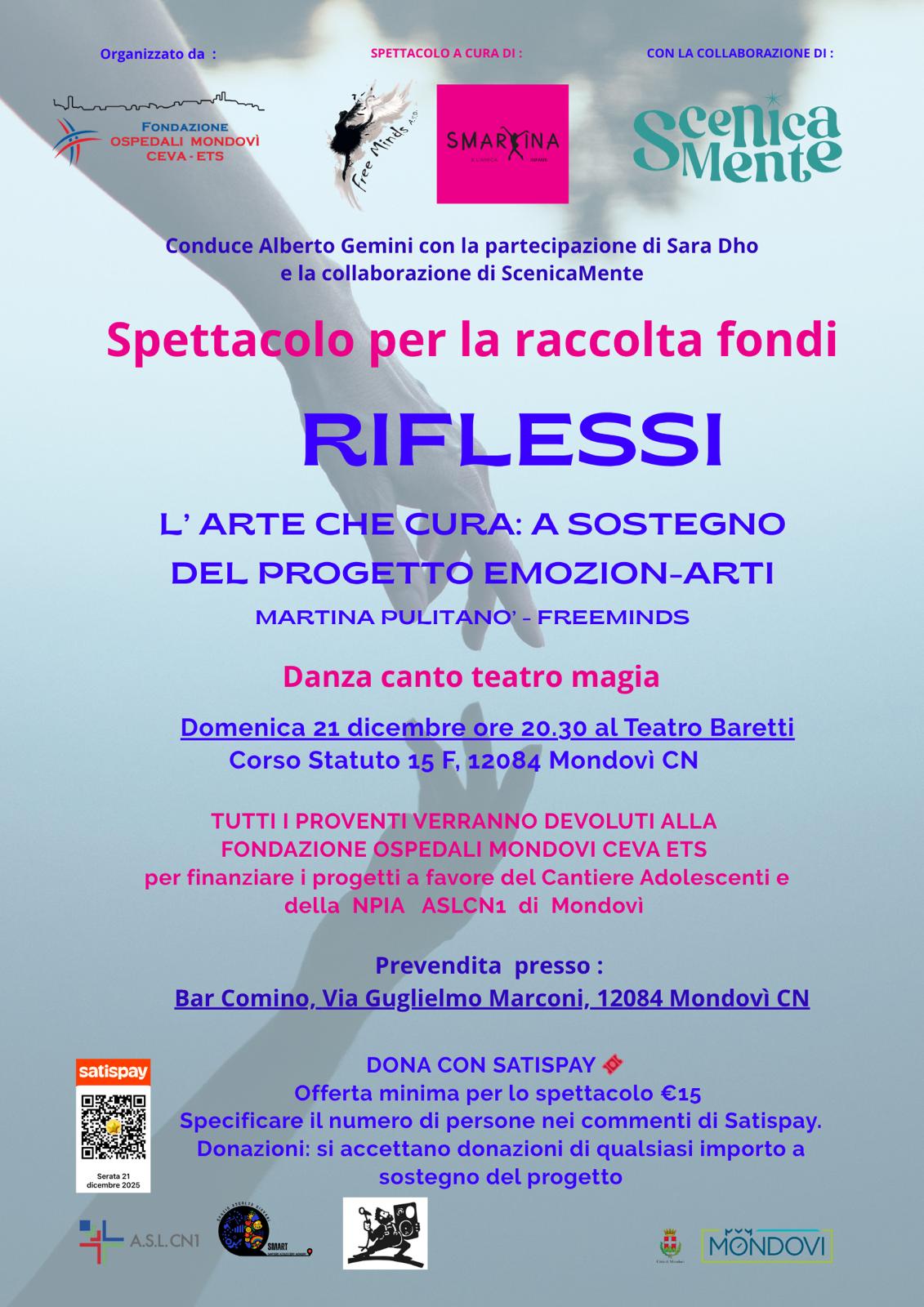 Domenica 21 dicembre, alle ore 20.30, al teatro Baretti di Mondovì (c.so Statuto 15F) è in programma “Riflessi”, spettacolo di danza, canto, teatro e magia per la raccolta fondi a sostegno del progetto Emozion-Arti.