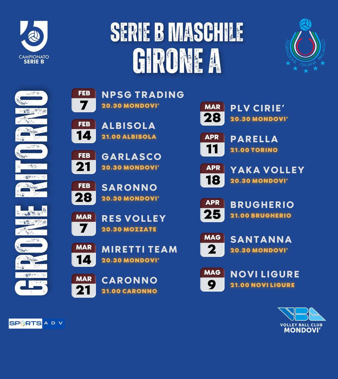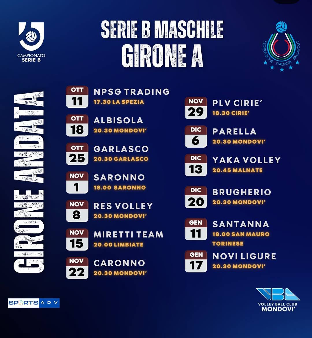 L'esordio, così non sarà in casa contro Caronno come precedentemente annunciato, ma a La Spezia sabato 11 ottobre alle 17,30. La prima partita casalinga per i ragazzi di Bertini è in calendario per sabato 18 ottobre contro Albisola. A seguire due trasferte a Garlasco dall’ex coach dell’LPM Davide Delmati e Saronno prima del ritorno a Mondovì sabato 8 novembre. Ultimo appuntamento dell'anno il 20 dicembre contro Brugherio, ripresa l'11 gennaio e il girone d'andata si chiuderà il 17 gennaio in casa contro Novi Ligure. Il girone di ritorno scatterà il 7 febbraio per chiudersi il 9 maggio.