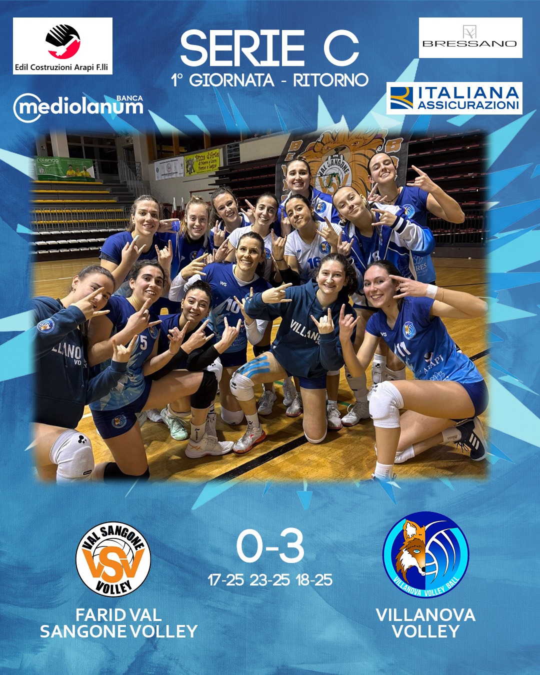 Dopo l'avvio equilibrato (6-6), poi Villanova cambia marcia: break sul servizio di Mollo e vantaggio 12-9. Val Sangone prova a rientrare (14-14), ma le Foxes non concedono spazio: nuovo allungo fino al 20-16 e chiusura autoritaria 25-17.