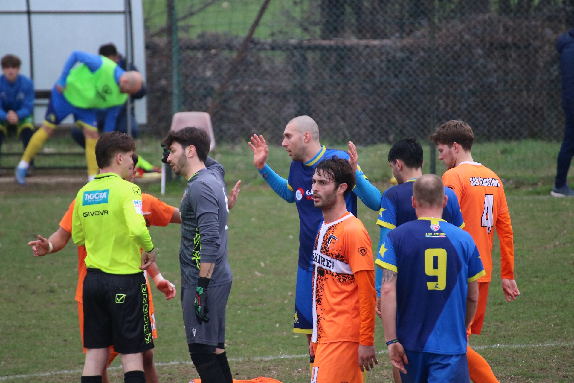 Il San Sebastiano bussa per la prima volta alla porta di Rossi intorno al 25’, con uno schema da palla inattiva: lancio lungo di Bertolino, Rrotani arriva prima delle maglie azzurre sulla palla e tenta il colpaccio con una conclusione al volo, ma il risultato non è dei migliori. L’Azzurra risponde con una sassata del solito Roccia dalla lunetta, che obbliga il numero uno ospite ad allungare il braccio per spegnere il pericolo. Anche la squadra di casa corre dei rischi, in particolare al 28’, quando Rossi compie un intervento a dir poco decisivo su Galliano all’interno dell’area piccola.