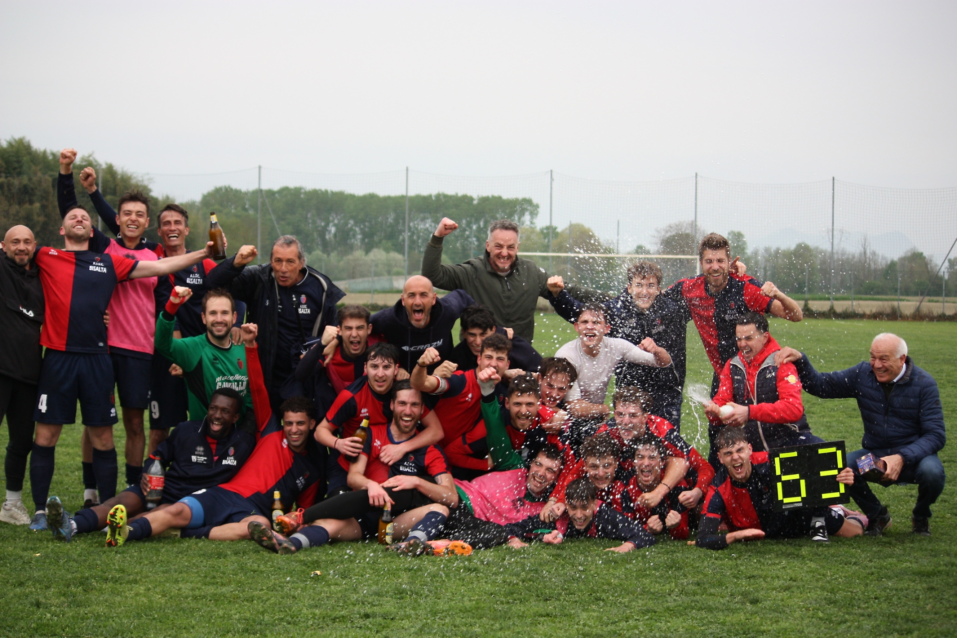 Di fatto, cala il sipario sulle velleità locali, già sufficientemente a pezzi. Ancor più quando l’arbitro, al rientro dopo l’intervallo, punisce un tocco di braccio di Konate con il penalty e Marino blocca a terra, fischiettando pure lui, il fiacco tiro di Gerbaudo dal dischetto. Come se non bastasse, un minuto dopo Gomes Aro spedisce Petris di nuovo davanti al portiere ed è il tris dell’imprendibile 11 bisaltino. Resta un intero secondo tempo da giocare, ma ci vorrebbe un inimmaginabile miracolo locale per rianimare l’equilibrio e il senso della contesa. La sabbia della clessidra scorre così anonima fino all’inutile 1-4 di Pochettino: sarebbe pure un bel gol, ma l’attaccante nemmeno accenna l’esultanza. Forse presagendo che di lì a pochi istanti Petris si sarebbe prodotto nell’ennesima magia: una sforbiciata acrobatica sul corner di Mestriner che va a sbattere sul secondo palo, dove Paolo Manfredi la riprende e la spinge dentro facile facile. Cinquina severa, ma giusta. E soprattutto spumeggiante, traboccante di qualità e di divertimento. Poi quei minuti appesi ai telefonini e al risultato del San Sebastiano, che si risolvono in un grido collettivo liberatorio e in tutto un caos di abbracci, esultanze sfrenate, foto e brindisi commemorativi. Il Bisalta è in Promozione, viva il Bisalta.