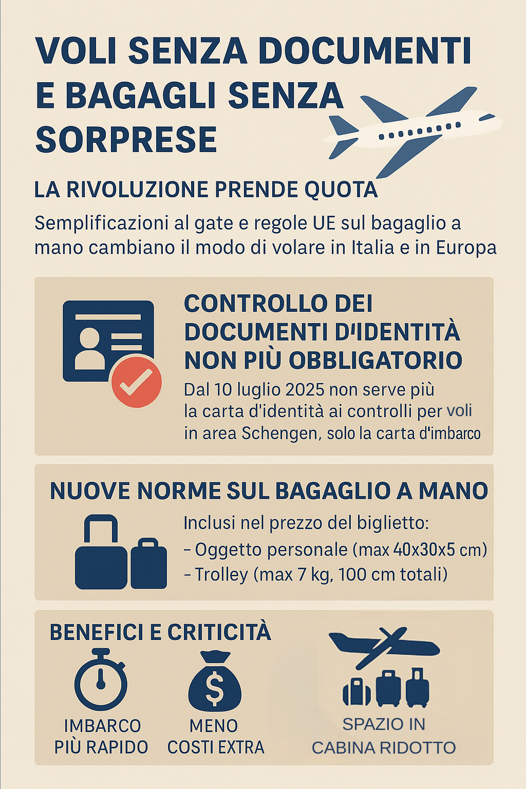 È l’inizio di una nuova era per i viaggiatori aerei in Italia e in Europa. Due novità entrate in vigore o in via di approvazione promettono di cambiare radicalmente il modo in cui ci si imbarca su un aereo: l’abolizione dell’obbligo di mostrare il documento d’identità per i voli nazionali e in area Schengen, e l’introduzione di regole comuni a livello UE sul bagaglio a mano, che dovrà essere sempre incluso nel biglietto base.