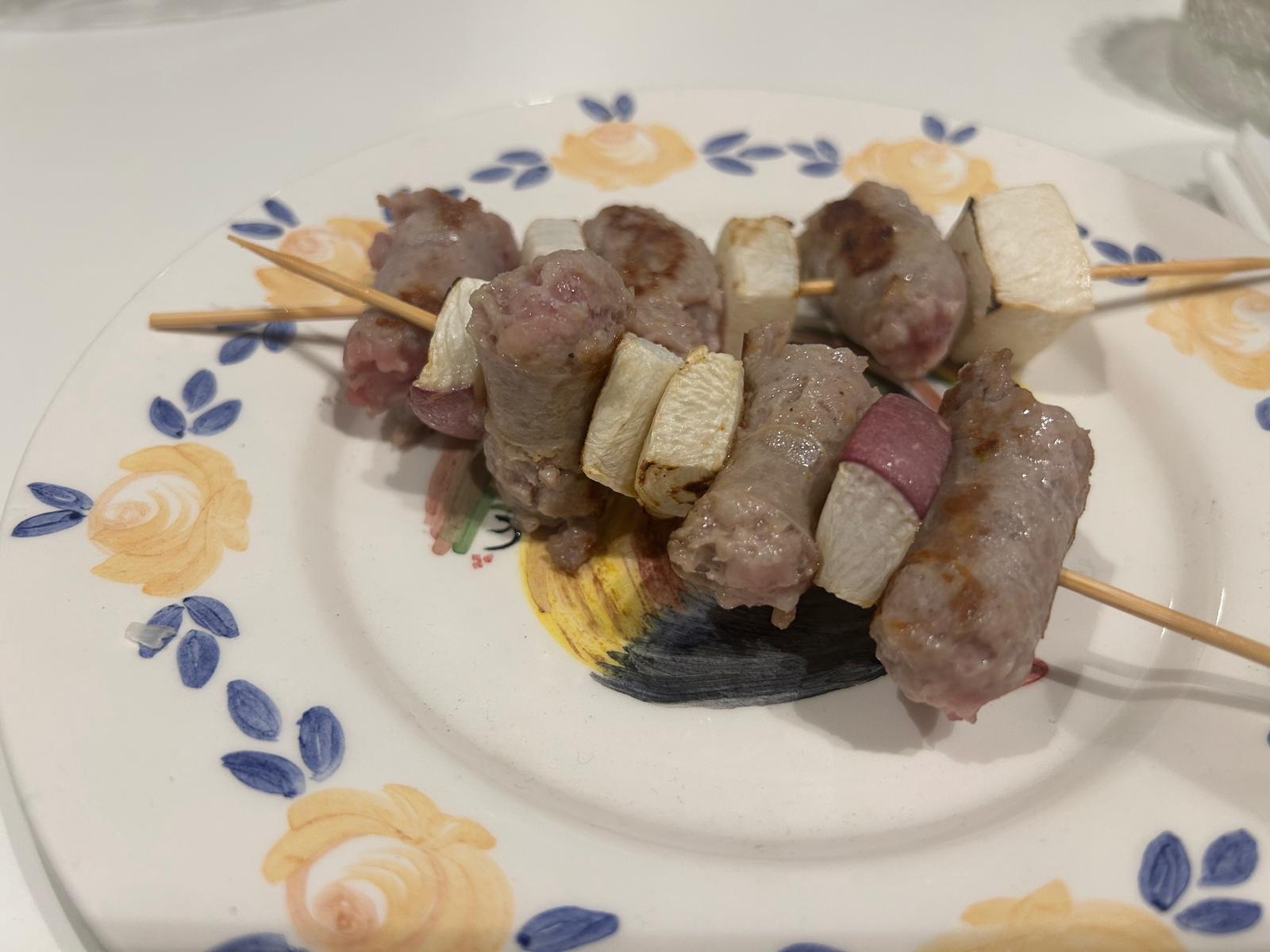 Tagliare la salsiccia della dimensione dei cubi di rapa e alternare salsiccia e rapa in uno spiedino di legno.