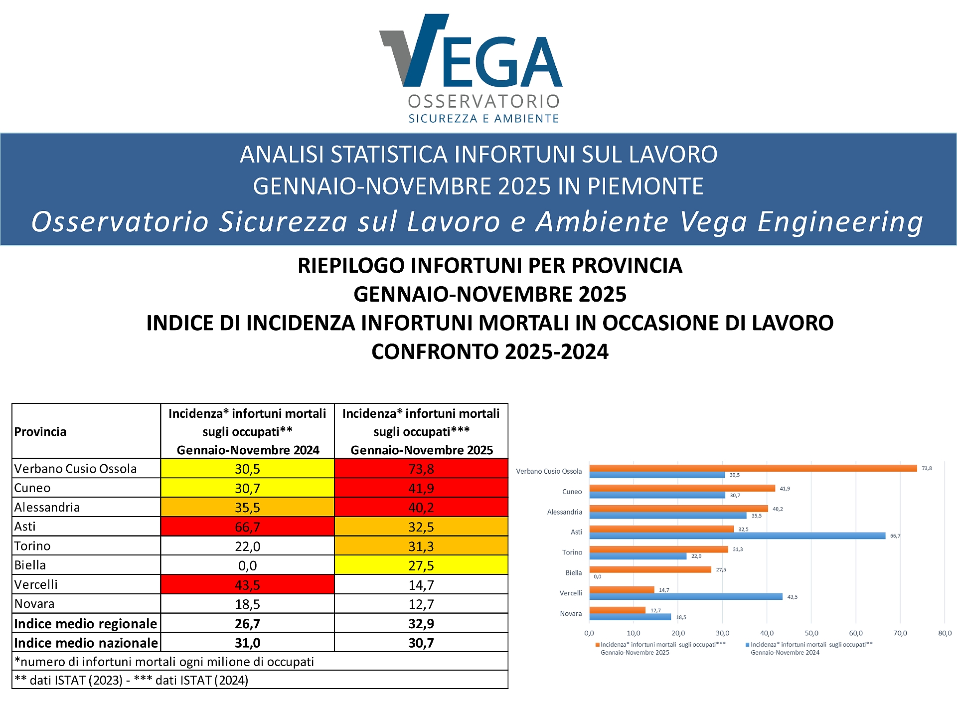 Secondo i dati aggiornati a novembre 2025, in Piemonte si contano 83 vittime sul lavoro da gennaio a novembre, 16 in più rispetto allo stesso periodo del 2024, quando erano state 67. Di queste, 61 sono morte in occasione di lavoro. Il dato regionale si traduce in un indice di mortalità pari a 32,9 morti per milione di occupati, superiore alla media italiana che si ferma a 30,7.
