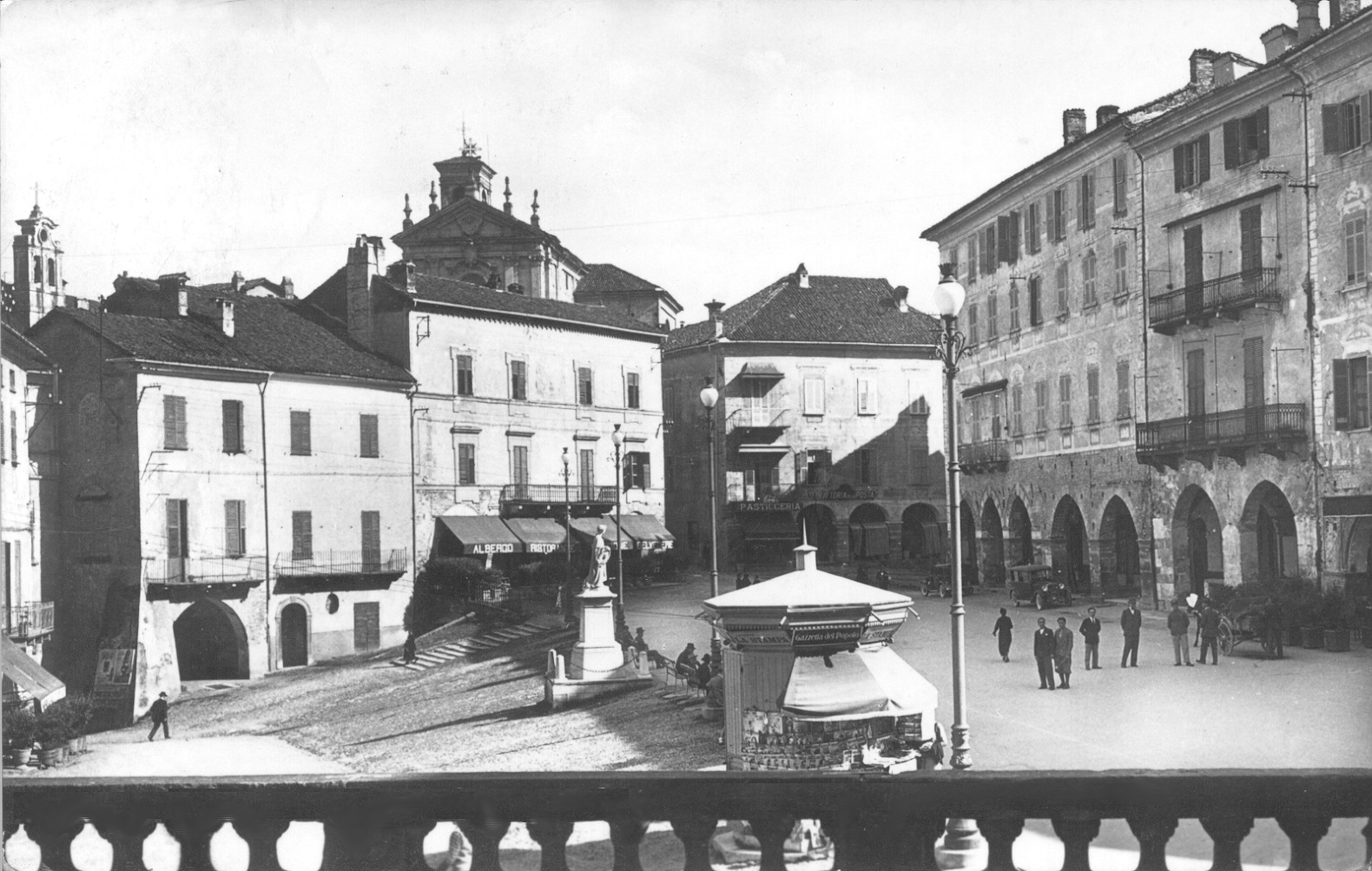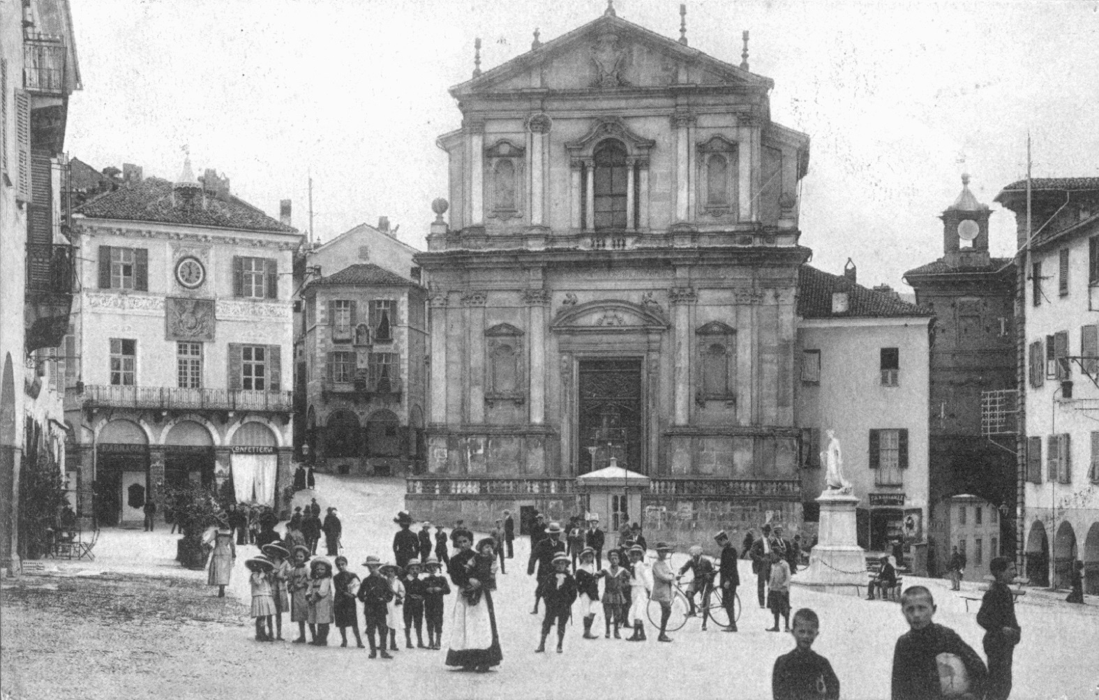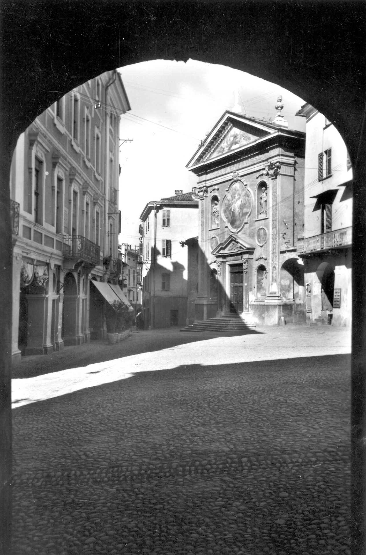 Ecco l'aspetto di piazza Santa Maria Maggiore a Mondovì, quando era ancora presente l'omonima chiesa Parrocchiale. Nel 1945, il 12 marzo, la chiesa sarebbe stata distrutta dalle bombe degli Alleati. Di fronte alla chiesa il Palazzo dei Conti Cordero di San Quintino: fu sede del Fascio, inaugurata il 6 settembre del 1925, e successivamente del Dopolavoro.