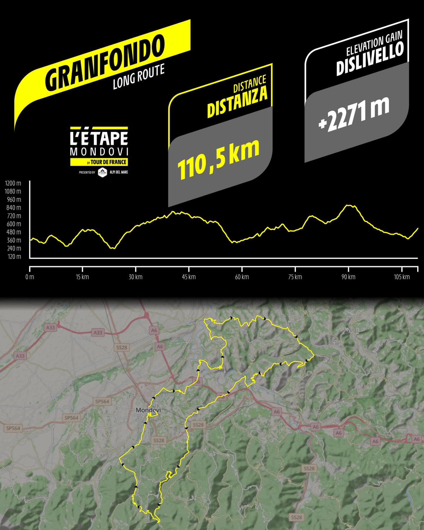 L’Étape Mondovì – Info percorso Granfondo: Distanza: 110,5 km. Dislivello: 2.271 m