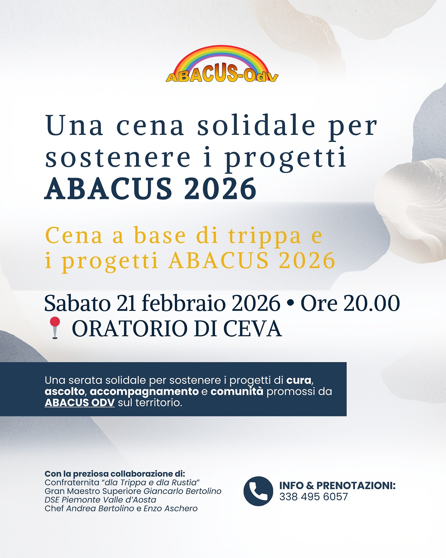 Ceva si prepara ad accendere i fornelli della solidarietà con un appuntamento che unisce convivialità e impegno concreto sul territorio. Sabato 21 febbraio 2026 alle ore 20.00, all’Oratorio di Ceva, torna la Cena a base di trippa organizzata da ABACUS ODV: una serata dal sapore autentico, pensata per fare la differenza.